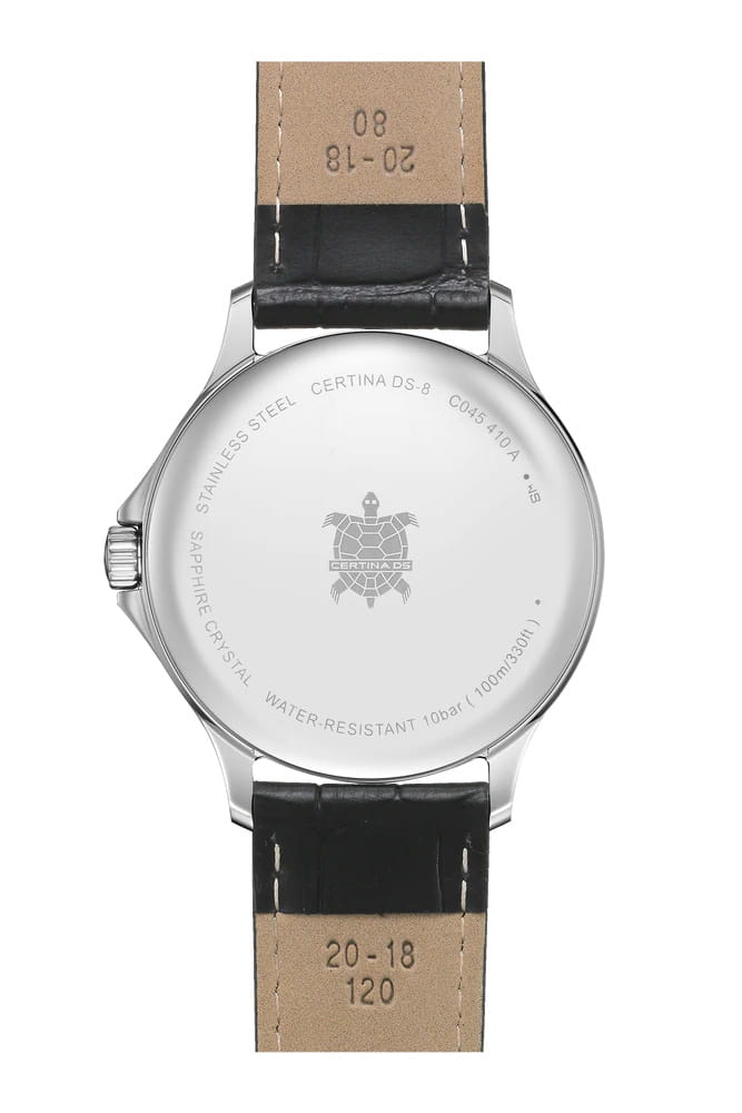 Швейцарские часы Certina DS-8 Gent C045.410.16.032.00 станут оригинальным дополнением повседневного образа. Часы с кварцевым механизмом с Precidrive™Precidrive™Инновационный кварцевый механизм Certina. Часы, оснащённые этим швейцарским калибром, приравниваются к точности к сертифицированным хронометрам, точность хода составляет +/-10 секунд в год.. Поверхность корпуса защищена сапфировым стекломСапфировое стеклоПрочный и надёжный материал из кристалла сапфира синтетического происхождения, характеризующийся особой твёрдостью и устойчивостью к царапинам и повреждениям. с антибликовым покрытиемАнтибликовое покрытиеСлой оксида металла в 0,13-0,3 микрон, благодаря которому стекло часов не бликует и не отражает свет. Антибликовое покрытие уменьшает отражение света в 10 раз, обеспечивая отличную читаемость показателей циферблата., устойчивым к царапинам и механическим повреждениям. Водостойкость 100 метров. Корпус из стали 316L с противокоррозионными свойствами. Браслет из кожи со стандартной застежкой. Функция EOLEOLПредставляет собой систему, уведомляющую владельца часов о необходимости замены элемента питания. За 2 недели до полного разряда батарейки секундная стрелка перестаёт ходить чётко и начинает перепрыгивать на 3-4 деления., отображение текущего числа. Диаметр корпуса: 40 мм.