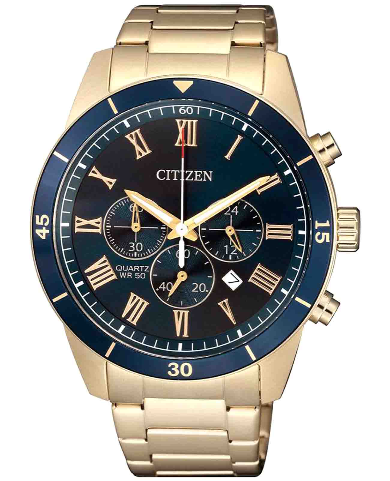 Citizen Chronograph AN8169-58L часы-хронографХронографФункция позволяет измерять отрезки времени с особой точностью: часы, минуты, секунды. Верным признаком хронографа является наличие на циферблате 3 дополнительных окошек-счётчиков. с секундомеромСекундомерСекундоме́р — прибор, способный измерять интервалы времени с точностью до долей секунды. спортивного дизайна с высоким уровнем водозащиты. Корпус из нержавеющей стали с частичным IP-покрытиемIP-покрытиеМетод ионного напыления. Демонстрирует повышенную устойчивость к истиранию, окислению и химическим веществам. Под воздействием высокого давления и температуры около 1500°C молекулы металла надёжно соединяются с частицами корпуса часов. диаметром 44 мм идеально сбалансирован. Минеральное стеклоМинеральное стеклоМинеральное стекло представляет собой искусственно выращенный минерал кварца. Такое стекло отличается особой устойчивостью к повреждениям и царапинам. Уступает по некоторым качествам сапфировому стеклу. обеспечивает отличную защиту циферблата от царапин. Часы работают на основе кварцевого механизма. Стальной браслет на раскладной застёжкеРаскладная застёжкаТакой тип застёжки используется только на браслетах из металла. Она никогда не раскрывается полностью, происходит разделение на 2 и более частей. Раскладывающая застёжка снизит вероятность потери часов к минимуму. идеально дополняют дизайн часов, обеспечивая комфортное ношение. Стрелки и метки на циферблате имеют люминесцентное покрытиеЛюминесцентное покрытиеПозволяет считывать показания времени в темноте. Производители наносят на стрелки, часовые индексы, безель или поверхность циферблата светонакопительный состав, дающий холодное свечение. позволяющее легко определять время даже в темноте. БезельБезельВнешний ободок, закрепляющий стекло. В спортивных часах так называется поворотное кольцо с делениями на циферблате, выполняет роль таймера – замеряет отрезки времени на шкале. Неподвижный безель – элемент декора. Однонаправленно вращающийся безель на дайверских часах позволяет фиксировать моменты погружения и выныривания на поверхность. с IP-покрытиемIP-покрытиеМетод ионного напыления. Демонстрирует повышенную устойчивость к истиранию, окислению и химическим веществам. Под воздействием высокого давления и температуры около 1500°C молекулы металла надёжно соединяются с частицами корпуса часов. и минутной шкалой. Циферблат с метками в виде штрихов выполнен по технологии Sunray (солнечные лучи). 12-ти и 24-х часовой формат времени отображается на отдельном циферблате. Окошко даты находится между часовыми отметками 4 и 5. Заводная головка с защитой. Часы обладают впечатляющей водонепроницаемостью до 50WR, что делает их идеальными для повседневной носки.