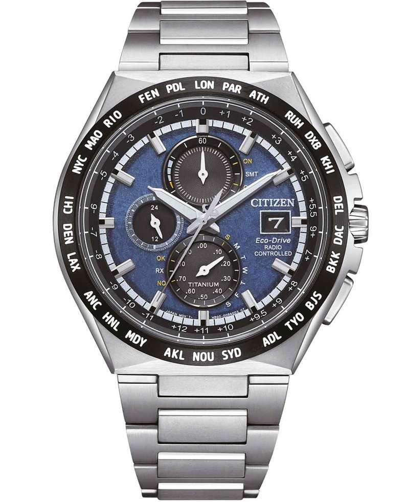 Японские наручные часы Citizen AT8238-84L сочетают в себе передовые технологии, надежность и стильный современный дизайн. Корпус и браслет выполнены из высокопрочного материала Super Titanium, который в пять раз тверже и на 40% легче стали, а также отличается высокой устойчивостью к царапинам и коррозии, а на безельБезельВнешний ободок, закрепляющий стекло. В спортивных часах так называется поворотное кольцо с делениями на циферблате, выполняет роль таймера – замеряет отрезки времени на шкале. Неподвижный безель – элемент декора. Однонаправленно вращающийся безель на дайверских часах позволяет фиксировать моменты погружения и выныривания на поверхность. нанесено черное IP-покрытиеIP-покрытиеМетод ионного напыления. Демонстрирует повышенную устойчивость к истиранию, окислению и химическим веществам. Под воздействием высокого давления и температуры около 1500°C молекулы металла надёжно соединяются с частицами корпуса часов.. Диаметр корпуса составляет 43,5 мм, толщина — 10 мм, а вес — всего 90 грамм, что обеспечивает легкость и комфорт при ежедневном ношении. Часы оснащены кварцевым хронографомХронографФункция позволяет измерять отрезки времени с особой точностью: часы, минуты, секунды. Верным признаком хронографа является наличие на циферблате 3 дополнительных окошек-счётчиков. на солнечной батарее с системой Eco-Drive, не требующей замены батарейки, и калибром Citizen H800, обеспечивающим до 6 месяцев работы без подзарядки и защиту от перезаряда. Особенностью модели является автоматическая синхронизация времени по радиосигналу в четырех регионах мира, охватывающая 26 часовых зон, а также функция мирового времениМировое время Полезное часовое усложнение, отображающее время в основных городах и известных областях по всему миру, оно связано с часовыми поясами, удобно для путешественников и бизнесменов. и вечного календаряВечный календарьКлассическое часовое усложнение, представляющее собой календарь, рассчитанный на несколько лет вперёд (стандартно – до 2099 года). Определяет текущую дату, день недели, месяц., рассчитанного до 2100 года. На синем циферблате расположены центральные часовая и минутная стрелки с люминесцентным покрытиемЛюминесцентное покрытиеПозволяет считывать показания времени в темноте. Производители наносят на стрелки, часовые индексы, безель или поверхность циферблата светонакопительный состав, дающий холодное свечение. для отличной читаемости в темноте, а также апертура даты в позиции 3 часов и отдельный малый циферблат для секундной стрелки. Часы поддерживают 12/24-часовой формат времени, оснащены секундомеромСекундомерСекундоме́р — прибор, способный измерять интервалы времени с точностью до долей секунды. с точностью 1/20 секунды и максимальным временем измерения 60 минут, а также индикатором окончания ресурса элемента питания EOLEOLПредставляет собой систему, уведомляющую владельца часов о необходимости замены элемента питания. За 2 недели до полного разряда батарейки секундная стрелка перестаёт ходить чётко и начинает перепрыгивать на 3-4 деления.. Устойчивое к царапинам сапфировое стеклоСапфировое стеклоПрочный и надёжный материал из кристалла сапфира синтетического происхождения, характеризующийся особой твёрдостью и устойчивостью к царапинам и повреждениям. с антибликовым покрытиемАнтибликовое покрытиеС
