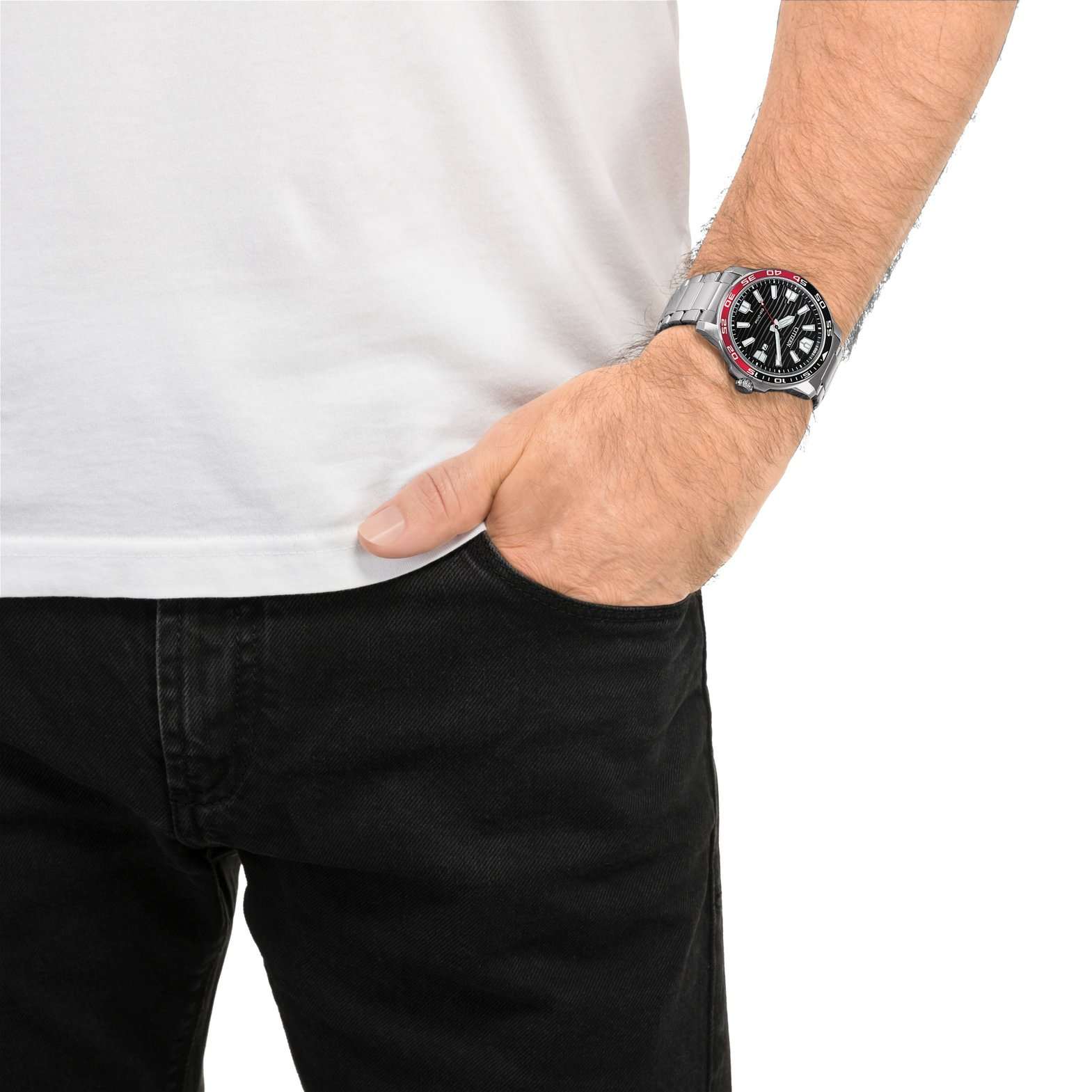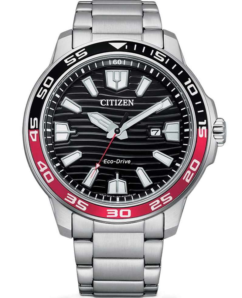 Часы Citizen AW1527-86E – это стильная и надежная модель японского производства, идеально подходящая для активного образа жизни. Корпус выполнен из высококачественной нержавеющей стали, в то время как на безельБезельВнешний ободок, закрепляющий стекло. В спортивных часах так называется поворотное кольцо с делениями на циферблате, выполняет роль таймера – замеряет отрезки времени на шкале. Неподвижный безель – элемент декора. Однонаправленно вращающийся безель на дайверских часах позволяет фиксировать моменты погружения и выныривания на поверхность. нанесено черное и красное PVD-покрытиеPVDУльтратонкое покрытие наносится в технике вакуумного напыления, сочетает в себе нитрид титана особой прочности со слоем золота или оксида хрома. Несёт в себе декоративную или защитную функцию., браслет также стальной. Черный циферблат украшен метками в виде штрихов и оснащен календарем с окошком даты. Защиту от повреждений обеспечивает прочное минеральное стеклоМинеральное стеклоМинеральное стекло представляет собой искусственно выращенный минерал кварца. Такое стекло отличается особой устойчивостью к повреждениям и царапинам. Уступает по некоторым качествам сапфировому стеклу., а водонепроницаемость до 100 метров позволяет не снимать часы во время плавания и занятий спортом. Внутри установлен надежный кварцевый механизм Citizen J810 с инновационной системой Eco-Drive, которая питается от солнечной энергии и не требует замены батарейки, обеспечивая запас хода до 240 дней. Стрелки и часовые метки с люминесцентным покрытиемЛюминесцентное покрытиеПозволяет считывать показания времени в темноте. Производители наносят на стрелки, часовые индексы, безель или поверхность циферблата светонакопительный состав, дающий холодное свечение. обеспечивают отличную читаемость даже в темноте. Функция индикации заряда EOLEOLПредставляет собой систему, уведомляющую владельца часов о необходимости замены элемента питания. За 2 недели до полного разряда батарейки секундная стрелка перестаёт ходить чётко и начинает перепрыгивать на 3-4 деления. подскажет, когда потребуется подзарядка. Корпус диаметром 45,9 мм, толщина 11,8 мм, ширина браслета 22 мм, вес модели составляет 160 граммов. Завинчивающаяся задняя крышка украшена фирменной гравировкой Eco-Drive, а заводная головка оснащена защитой. Надежная раскладная застёжкаРаскладная застёжкаТакой тип застёжки используется только на браслетах из металла. Она никогда не раскрывается полностью, происходит разделение на 2 и более частей. Раскладывающая застёжка снизит вероятность потери часов к минимуму. браслета с системой блокировки гарантирует комфортное и безопасное ношение.