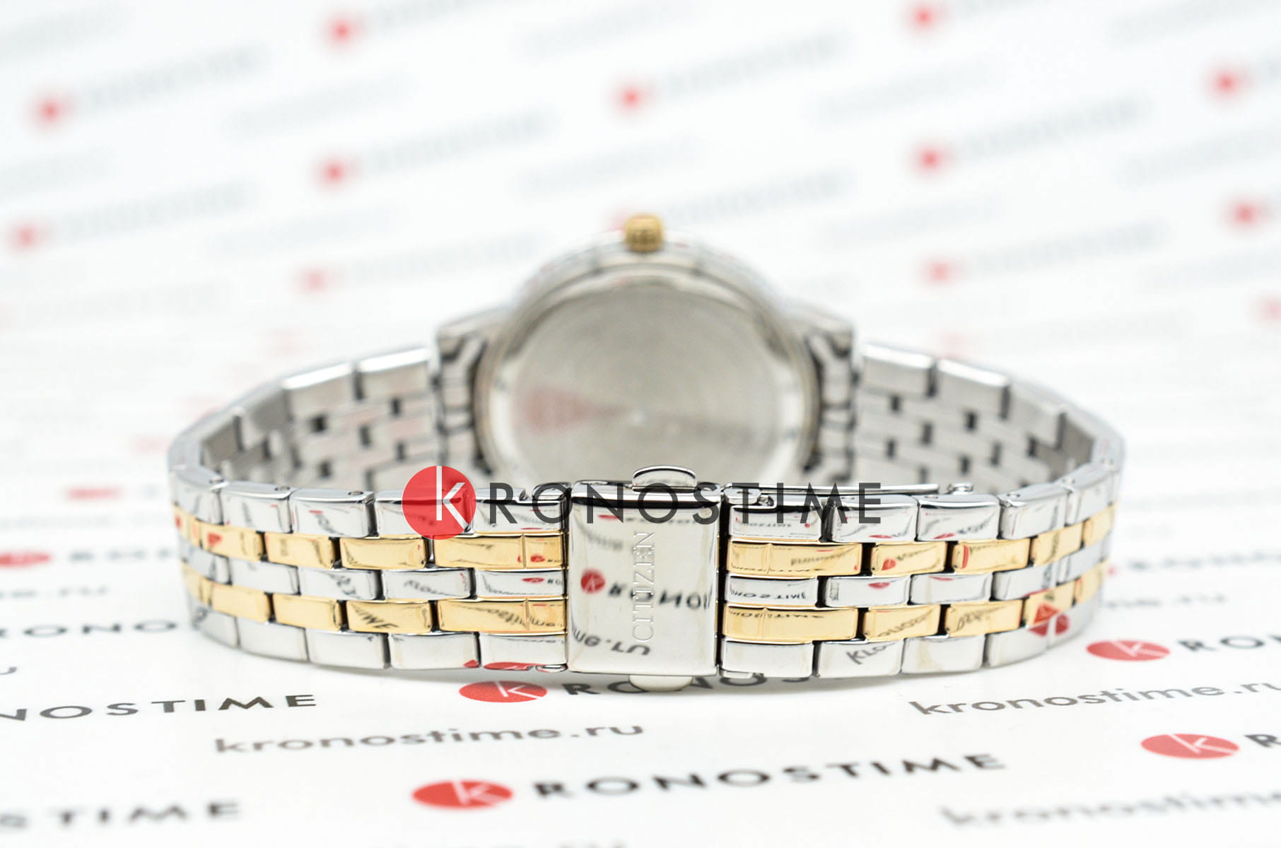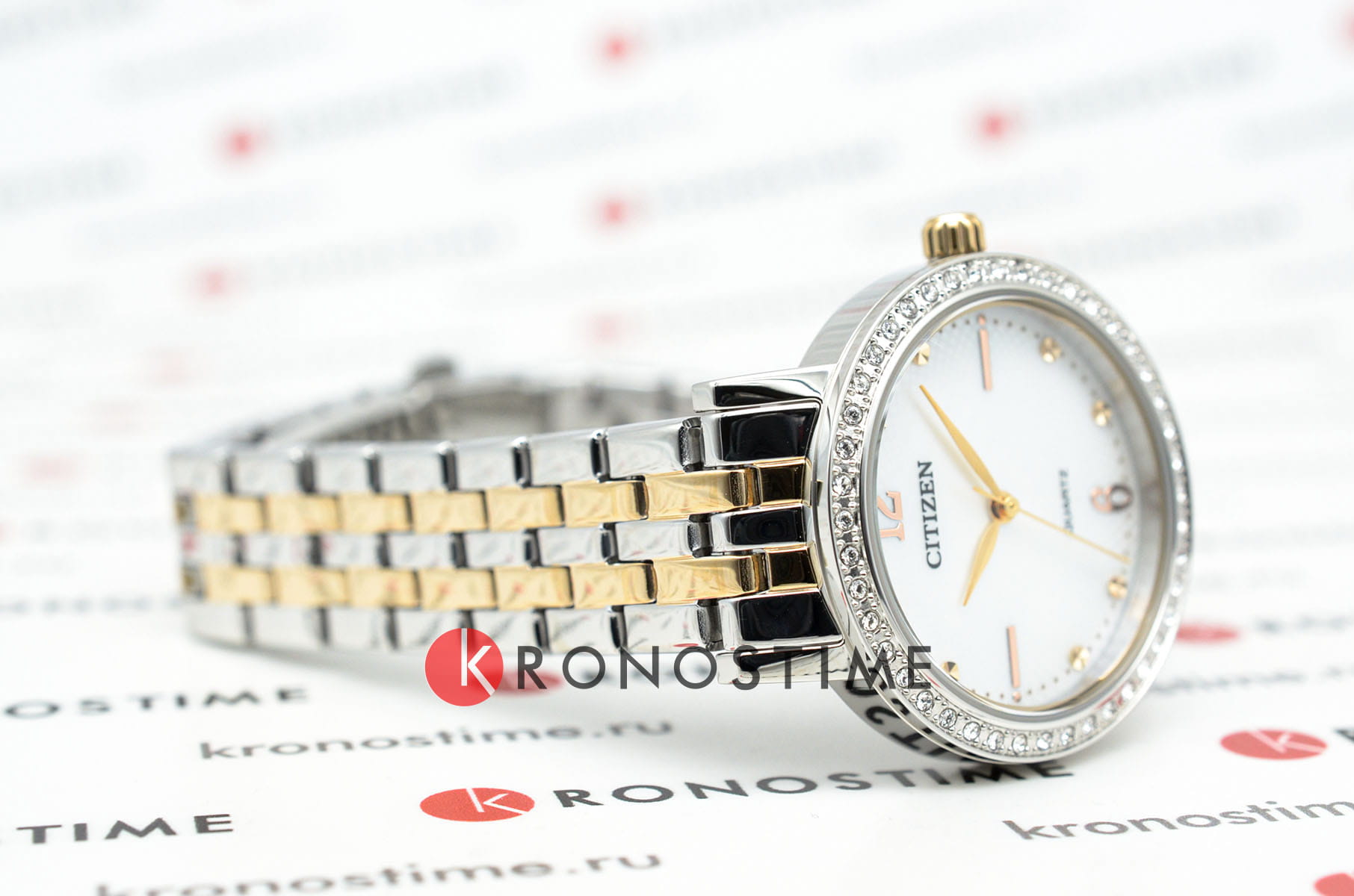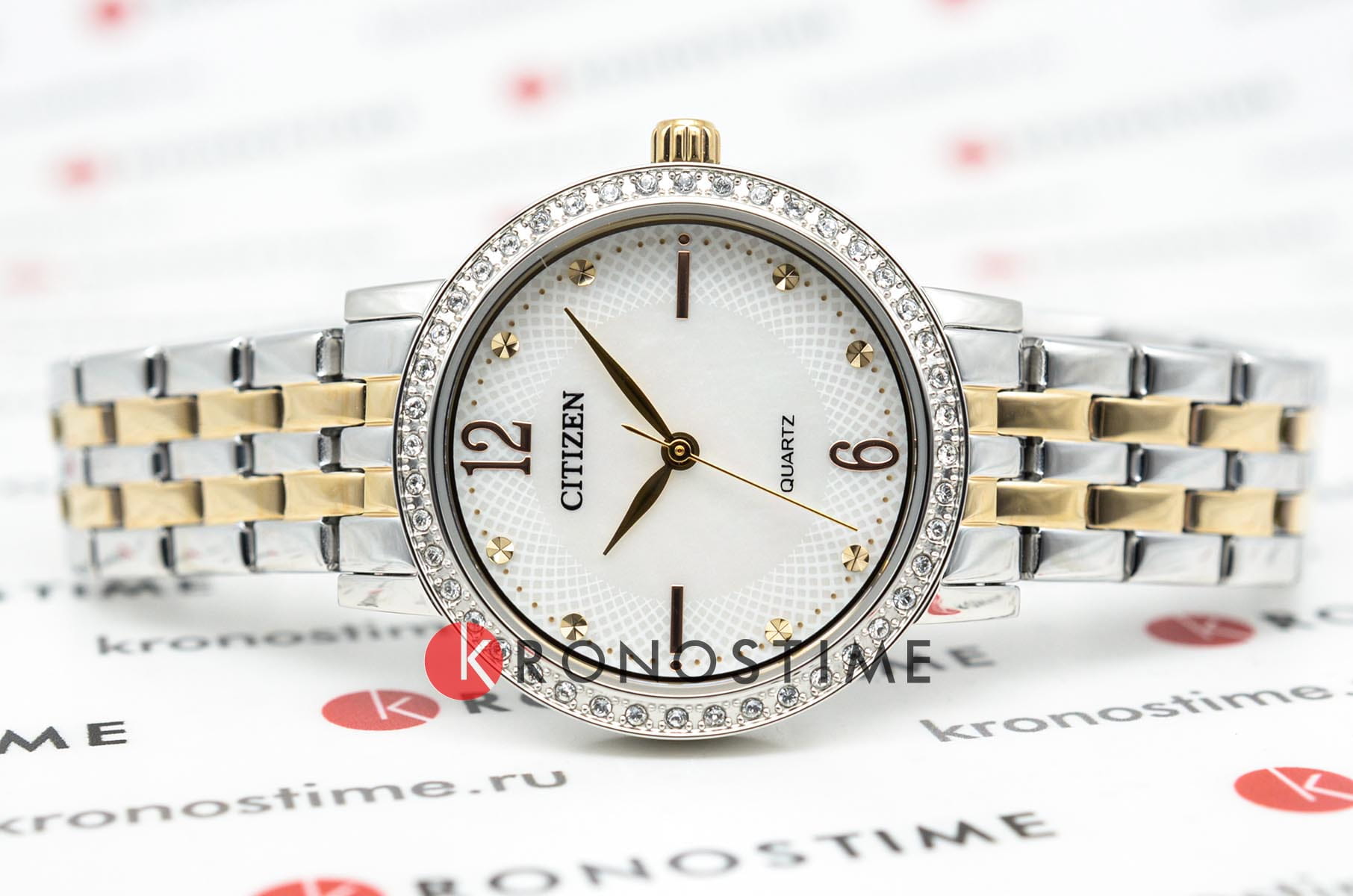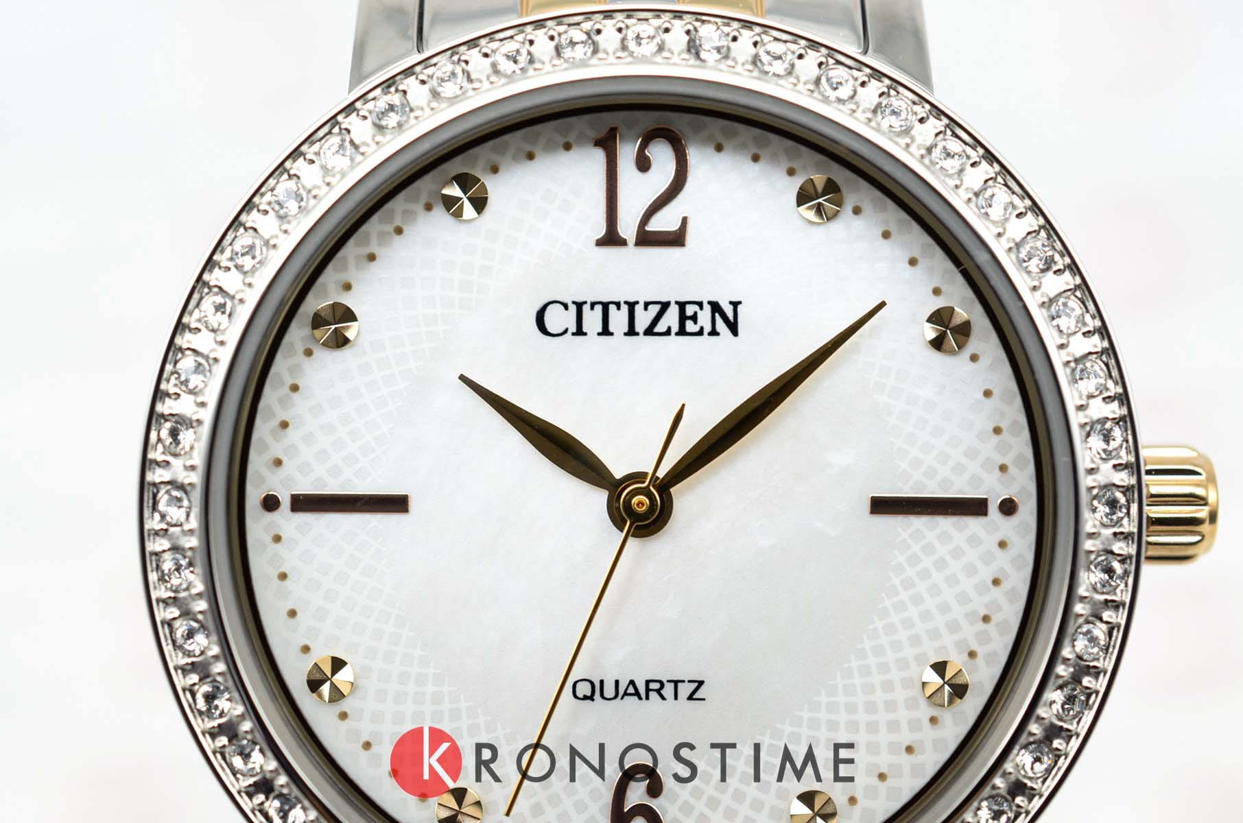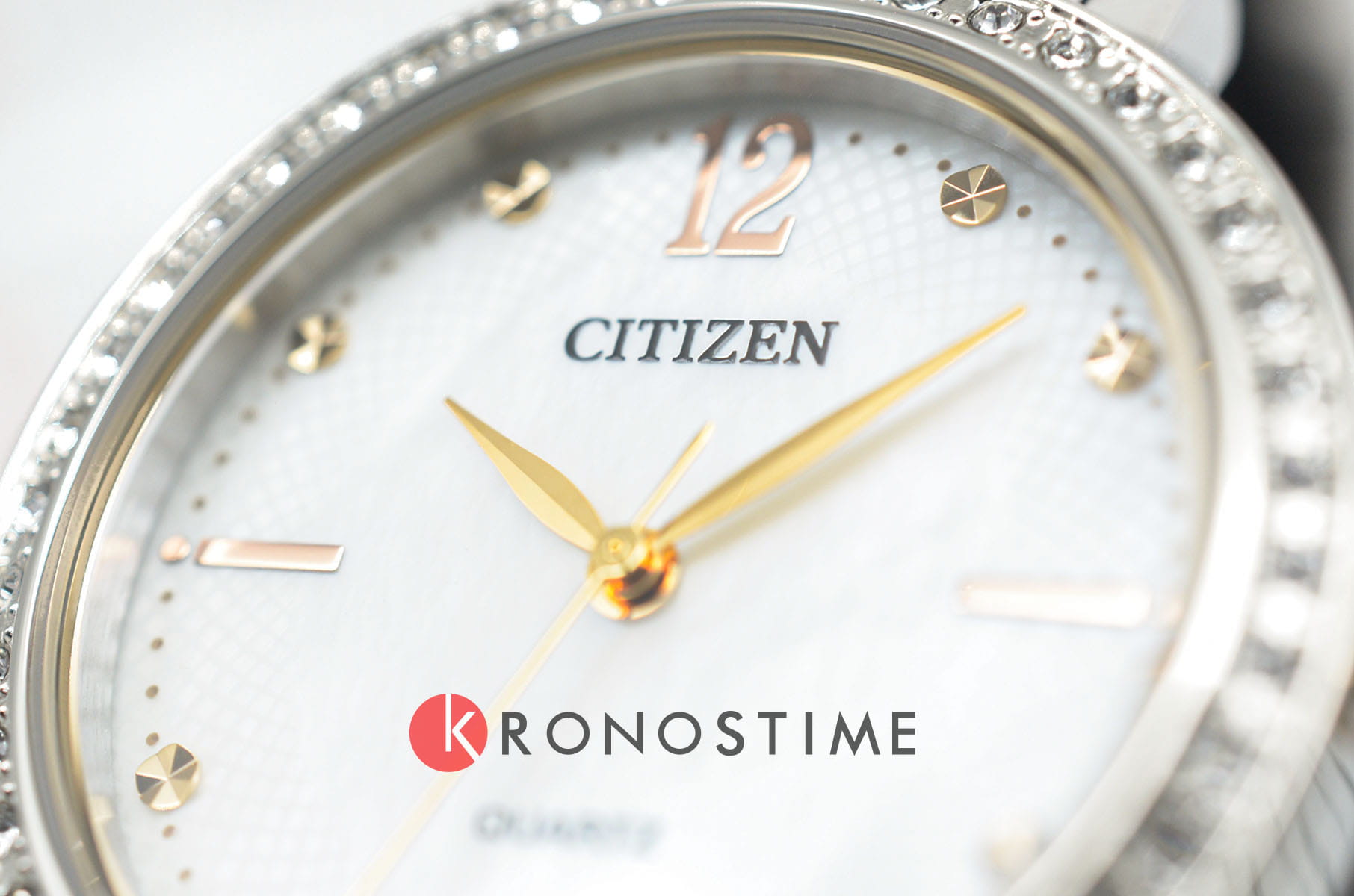 Часы Citizen EL3106-59D представляют собой элегантную модель, выполненную в Японии, сочетающую в себе современные технологии и утончённый дизайн. Корпус изготовлен из прочной нержавеющей стали, что обеспечивает долговечность и привлекательный внешний вид. Диаметр корпуса составляет 31 мм, а толщина — всего 7 мм, что делает часы изящными и аккуратными на запястье. Особое внимание привлекает безельБезельВнешний ободок, закрепляющий стекло. В спортивных часах так называется поворотное кольцо с делениями на циферблате, выполняет роль таймера – замеряет отрезки времени на шкале. Неподвижный безель – элемент декора. Однонаправленно вращающийся безель на дайверских часах позволяет фиксировать моменты погружения и выныривания на поверхность., украшенный мерцающими кристаллами, которые придают часам особый шарм и изысканность. Надёжный кварцевый механизм гарантирует точность хода, а водозащита уровня WR 50 позволяет не снимать часы при мытье рук или во время дождя. Перламутровый циферблат украшен часовыми индексами в виде точек и цифр, а также оснащён центральными стрелками часов, минут и секунд для удобного считывания времени и кристаллами. Минеральное стеклоМинеральное стеклоМинеральное стекло представляет собой искусственно выращенный минерал кварца. Такое стекло отличается особой устойчивостью к повреждениям и царапинам. Уступает по некоторым качествам сапфировому стеклу. устойчиво к появлению мелких царапин, сохраняя прозрачность и презентабельный вид. Стальной браслет с частичным золотистым IP-покрытиемIP-покрытиеМетод ионного напыления. Демонстрирует повышенную устойчивость к истиранию, окислению и химическим веществам. Под воздействием высокого давления и температуры около 1500°C молекулы металла надёжно соединяются с частицами корпуса часов. и раскладной застёжкойРаскладная застёжкаТакой тип застёжки используется только на браслетах из металла. Она никогда не раскрывается полностью, происходит разделение на 2 и более частей. Раскладывающая застёжка снизит вероятность потери часов к минимуму. надежно фиксирует часы на запястье, обеспечивая комфорт при ежедневном ношении.