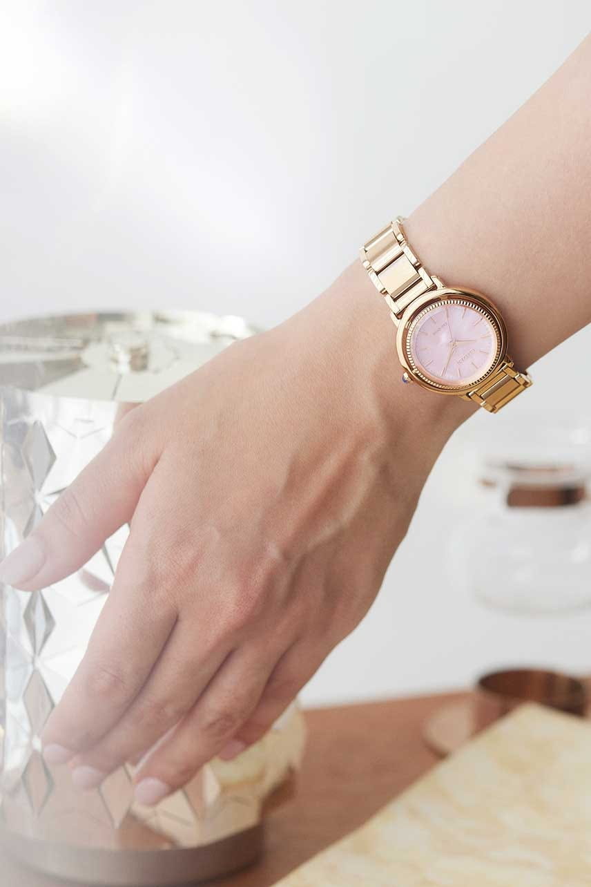 Элегантные часы Citizen EM1103-86Y произведены в Японии и оснащены современным кварцевым механизмом Citizen E031 с инновационной системой Eco-Drive, которая использует энергию солнечного света и не требует замены батарейки, обеспечивая до 180 дней работы в автономном режиме. Корпус и браслет выполнены из высококачественной нержавеющей стали с золотым IP-покрытиемIP-покрытиеМетод ионного напыления. Демонстрирует повышенную устойчивость к истиранию, окислению и химическим веществам. Под воздействием высокого давления и температуры около 1500°C молекулы металла надёжно соединяются с частицами корпуса часов., что гарантирует долговечность и износостойкость. Перламутровый голубой и розовый циферблат с изящными штриховыми метками защищён выпуклым сапфировым стекломСапфировое стеклоПрочный и надёжный материал из кристалла сапфира синтетического происхождения, характеризующийся особой твёрдостью и устойчивостью к царапинам и повреждениям., устойчивым к царапинам. БезельБезельВнешний ободок, закрепляющий стекло. В спортивных часах так называется поворотное кольцо с делениями на циферблате, выполняет роль таймера – замеряет отрезки времени на шкале. Неподвижный безель – элемент декора. Однонаправленно вращающийся безель на дайверских часах позволяет фиксировать моменты погружения и выныривания на поверхность. часов декорирован алмазной гранью, а заводная головка украшена камнем в форме кабошона, что придаёт модели особый шарм. Задняя крышка закреплена на четырёх винтах, что повышает надёжность конструкции. Часы имеют водозащиту до 50 метров, а также функцию индикации заряда и предотвращения перезарядки. Размер корпуса составляет 31,2 мм в диаметре и 8 мм в толщину, вес — 71 грамм. Застежка «бабочка»Застёжка "бабочка"Такой вид застёжки дополняется предохранителями, помогающими избежать случайного раскрытия браслета. Обладают изящным исполнением. у браслета обеспечивает комфортное и надёжное ношение. Эта модель идеально подчеркнёт изысканный стиль и индивидуальность своей обладательницы.