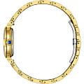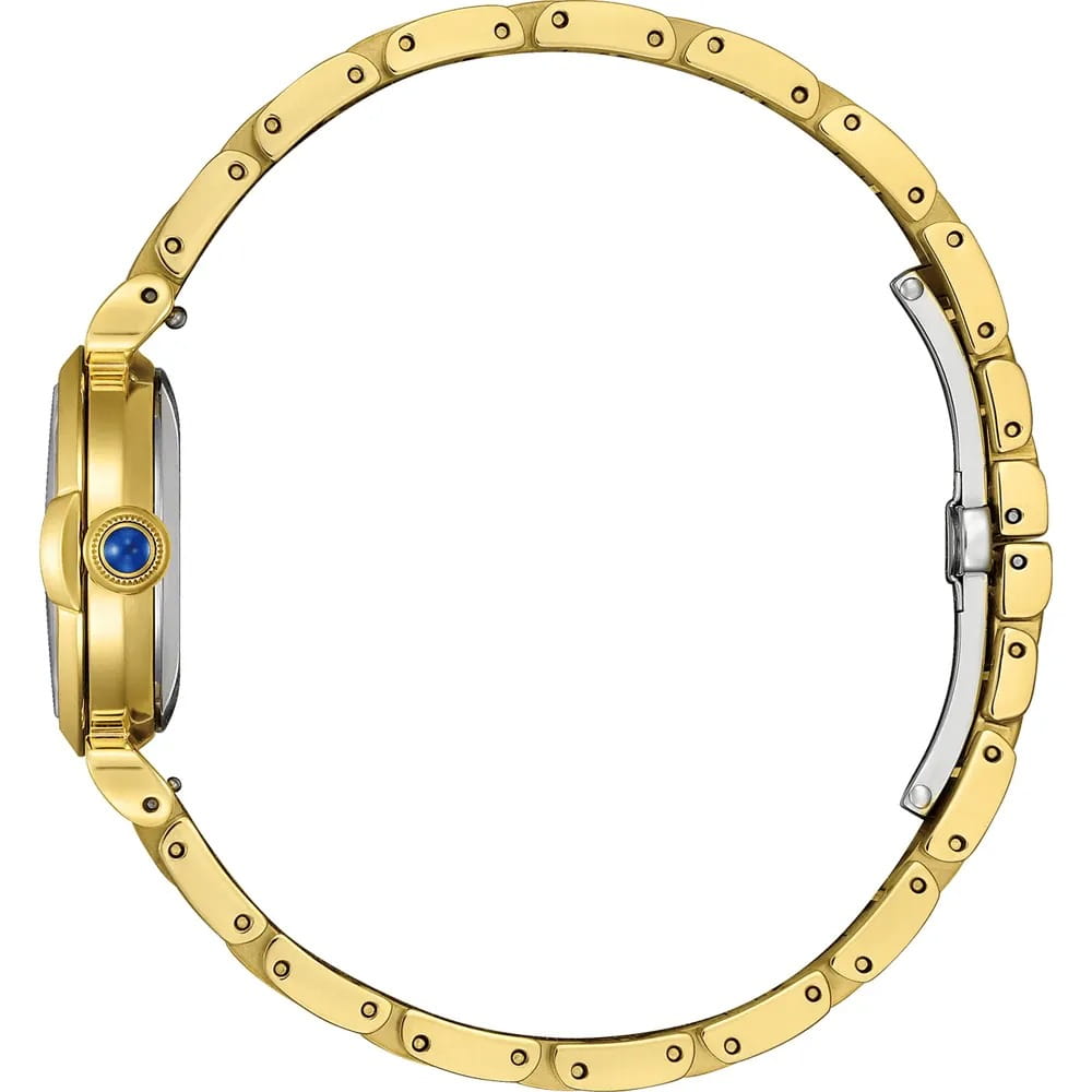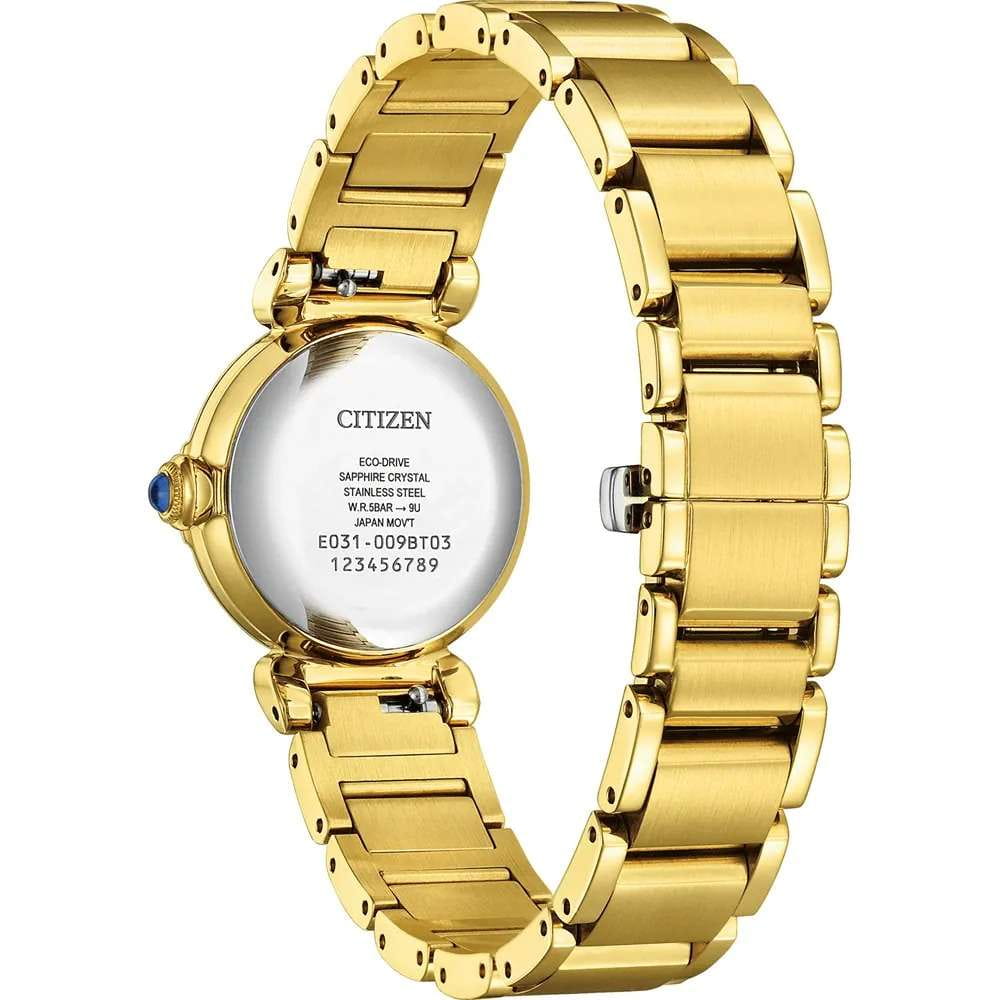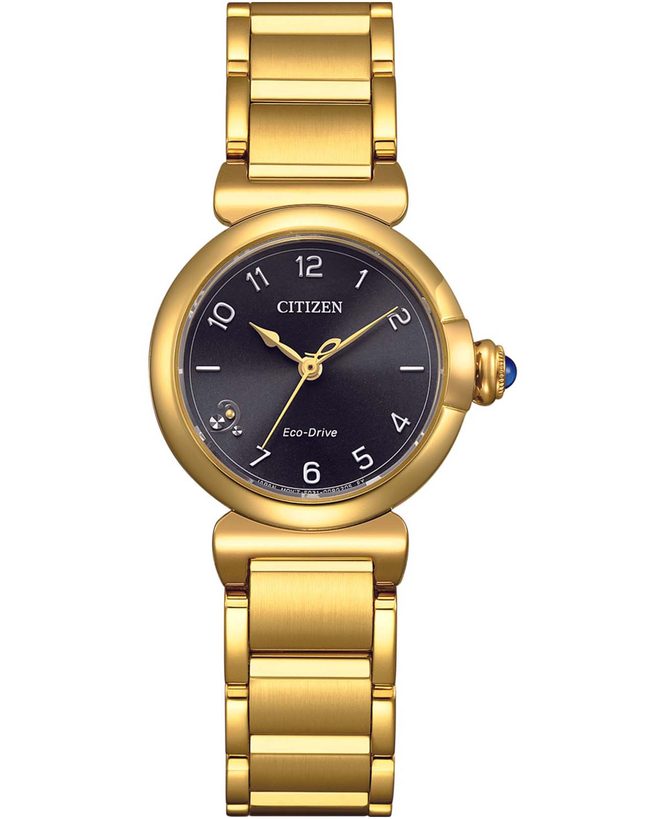 Элегантные японские часы Citizen EM1132-88H сочетают в себе современные технологии и изысканный дизайн. Кварцевый механизм Eco-Drive Caliber E031 обеспечивает высокую точность и не требует замены батареек, получая энергию от любого источника света. Корпус диаметром 26 мм и толщиной 8,1 мм выполнен из прочной нержавеющей стали с золотистым IP-покрытиемIP-покрытиеМетод ионного напыления. Демонстрирует повышенную устойчивость к истиранию, окислению и химическим веществам. Под воздействием высокого давления и температуры около 1500°C молекулы металла надёжно соединяются с частицами корпуса часов., вес модели составляет 70 гр. Сапфировое стеклоСапфировое стеклоПрочный и надёжный материал из кристалла сапфира синтетического происхождения, характеризующийся особой твёрдостью и устойчивостью к царапинам и повреждениям. отличается высокой устойчивостью к царапинам и мелким повреждениям. Черный циферблат украшен арабскими цифрами и аккуратными метками в виде точек. Центральные часовая, минутная и секундная стрелки обеспечивают удобное считывание времени. Стальной браслет с золотистым IP-покрытиемIP-покрытиеМетод ионного напыления. Демонстрирует повышенную устойчивость к истиранию, окислению и химическим веществам. Под воздействием высокого давления и температуры около 1500°C молекулы металла надёжно соединяются с частицами корпуса часов. оснащён надёжной застежкой «бабочка»Застёжка "бабочка"Такой вид застёжки дополняется предохранителями, помогающими избежать случайного раскрытия браслета. Обладают изящным исполнением. . Водонепроницаемость на уровне WR 50 позволяет не снимать часы во время мытья рук или прогулок под дождём.