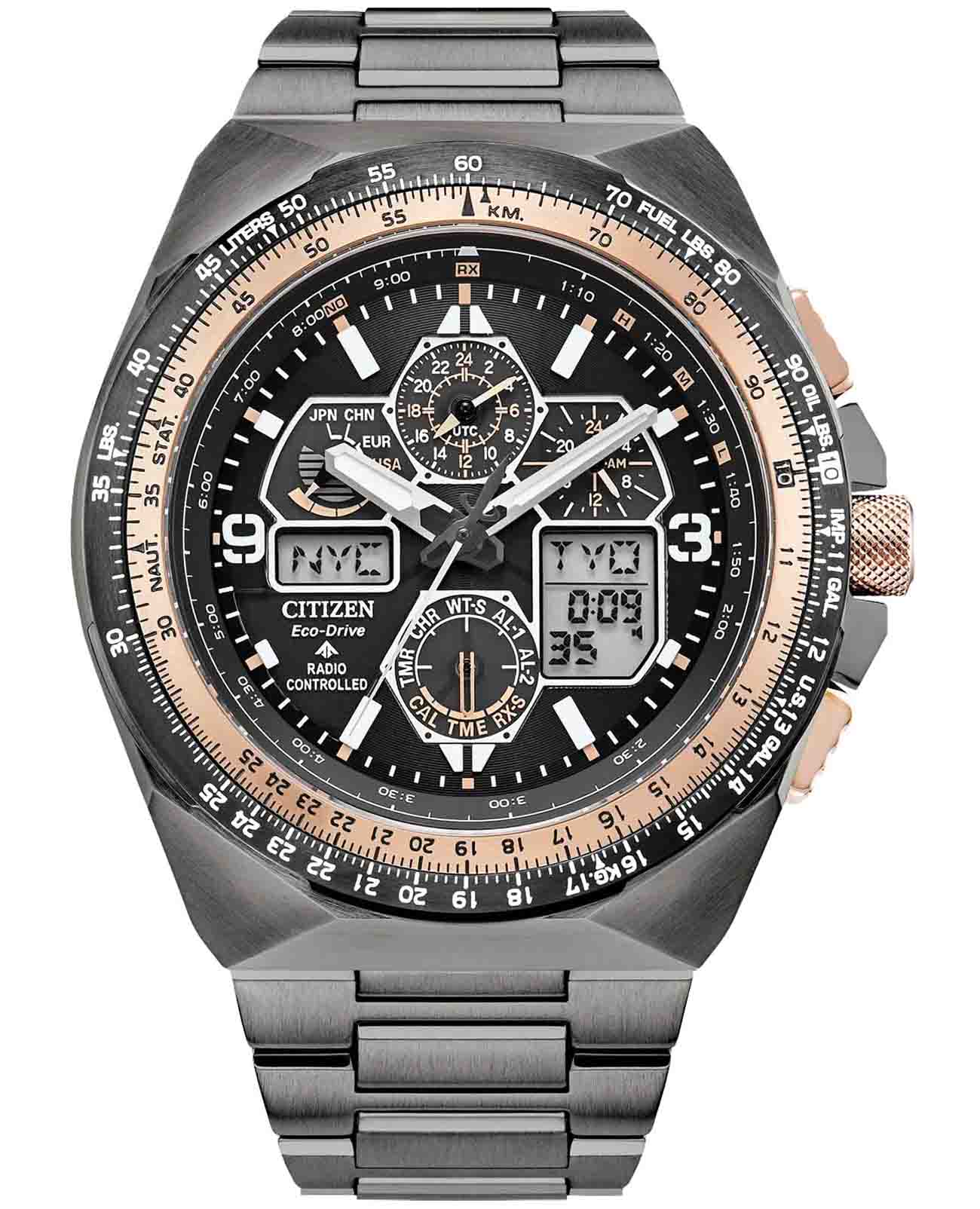 Citizen Promaster JY8146-54E часы-хронографХронографФункция позволяет измерять отрезки времени с особой точностью: часы, минуты, секунды. Верным признаком хронографа является наличие на циферблате 3 дополнительных окошек-счётчиков. с секундомеромСекундомерСекундоме́р — прибор, способный измерять интервалы времени с точностью до долей секунды. спортивного дизайна с высоким уровнем водозащиты. Лимитированная серия - 5600 экземпляров. Модель посвящена 35-летию коллекции Promaster. Корпус из нержавеющей стали с IP-покрытиемIP-покрытиеМетод ионного напыления. Демонстрирует повышенную устойчивость к истиранию, окислению и химическим веществам. Под воздействием высокого давления и температуры около 1500°C молекулы металла надёжно соединяются с частицами корпуса часов. диаметром 45,7 мм идеально сбалансирован. Сапфировое стеклоСапфировое стеклоПрочный и надёжный материал из кристалла сапфира синтетического происхождения, характеризующийся особой твёрдостью и устойчивостью к царапинам и повреждениям. с антибликовым покрытием обеспечивает отличную защиту циферблата от царапин. Часы работают на основе кварцевого механизма, питание от солнечной энергии. Стальной браслет на раскладной застёжкеРаскладная застёжкаТакой тип застёжки используется только на браслетах из металла. Она никогда не раскрывается полностью, происходит разделение на 2 и более частей. Раскладывающая застёжка снизит вероятность потери часов к минимуму. идеально дополняют дизайн часов, обеспечивая комфортное ношение. Стрелки и метки на циферблате имеют люминесцентное покрытиеЛюминесцентное покрытиеПозволяет считывать показания времени в темноте. Производители наносят на стрелки, часовые индексы, безель или поверхность циферблата светонакопительный состав, дающий холодное свечение. позволяющее легко определять время даже в темноте. Поворотный безельБезельВнешний ободок, закрепляющий стекло. В спортивных часах так называется поворотное кольцо с делениями на циферблате, выполняет роль таймера – замеряет отрезки времени на шкале. Неподвижный безель – элемент декора. Однонаправленно вращающийся безель на дайверских часах позволяет фиксировать моменты погружения и выныривания на поверхность. с IP-покрытиемIP-покрытиеМетод ионного напыления. Демонстрирует повышенную устойчивость к истиранию, окислению и химическим веществам. Под воздействием высокого давления и температуры около 1500°C молекулы металла надёжно соединяются с частицами корпуса часов.. Автоматический прием сигналов от радиовышек, расположенных в различных точках земного шара, которые передают временные сигналы от определенных атомных часов. Коррекция текущего времени радиосигналом на территории почти всей Европы, США, Японии и Китая. Функция индикации заряда (EOL) и предотвращения перезарядки. Мировое времяМировое время Полезное часовое усложнение, отображающее время в основных городах и известных областях по всему миру, оно связано с часовыми поясами, удобно для путешественников и бизнесменов. - 43 города, переход на зимнее и летнее время. Всемирное координированное время UTCUTCВсемирное кординационное время, не имеющее привязки к географическому положению Гринвича, основывается на атомном отсчёте времени. Регулировка времени осуществляется более точно, чем устаревшее GMT.