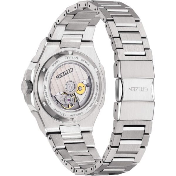 Citizen SERIES 8 NB6031-56E мужские часы спортивного дизайна с высоким уровнем водозащиты. Корпус из нержавеющей стали диаметром 41 мм идеально сбалансирован. Сапфировое стеклоСапфировое стеклоПрочный и надёжный материал из кристалла сапфира синтетического происхождения, характеризующийся особой твёрдостью и устойчивостью к царапинам и повреждениям. с антибликовым покрытием обеспечивает отличную защиту циферблата от царапин. Механические часы с автоподзаводом. Стальной браслет на раскладной застёжкеРаскладная застёжкаТакой тип застёжки используется только на браслетах из металла. Она никогда не раскрывается полностью, происходит разделение на 2 и более частей. Раскладывающая застёжка снизит вероятность потери часов к минимуму. идеально дополняют дизайн часов, обеспечивая комфортное ношение. Стрелки и метки на циферблате имеют люминесцентное покрытиеЛюминесцентное покрытиеПозволяет считывать показания времени в темноте. Производители наносят на стрелки, часовые индексы, безель или поверхность циферблата светонакопительный состав, дающий холодное свечение. позволяющее легко определять время даже в темноте. БезельБезельВнешний ободок, закрепляющий стекло. В спортивных часах так называется поворотное кольцо с делениями на циферблате, выполняет роль таймера – замеряет отрезки времени на шкале. Неподвижный безель – элемент декора. Однонаправленно вращающийся безель на дайверских часах позволяет фиксировать моменты погружения и выныривания на поверхность. с IP-покрытиемIP-покрытиеМетод ионного напыления. Демонстрирует повышенную устойчивость к истиранию, окислению и химическим веществам. Под воздействием высокого давления и температуры около 1500°C молекулы металла надёжно соединяются с частицами корпуса часов.. Окошко даты находится в положении 3 часа. Магнитоустойчивость 16000 а/м. Запас хода около 50 часов. Часы обладают впечатляющей водонепроницаемостью до 100WR, что делает их идеальными для повседневной носки. Прозрачная задняя крышка.