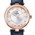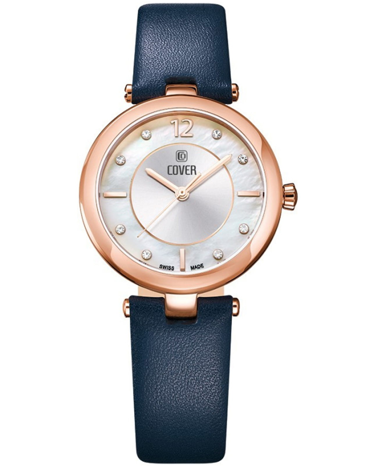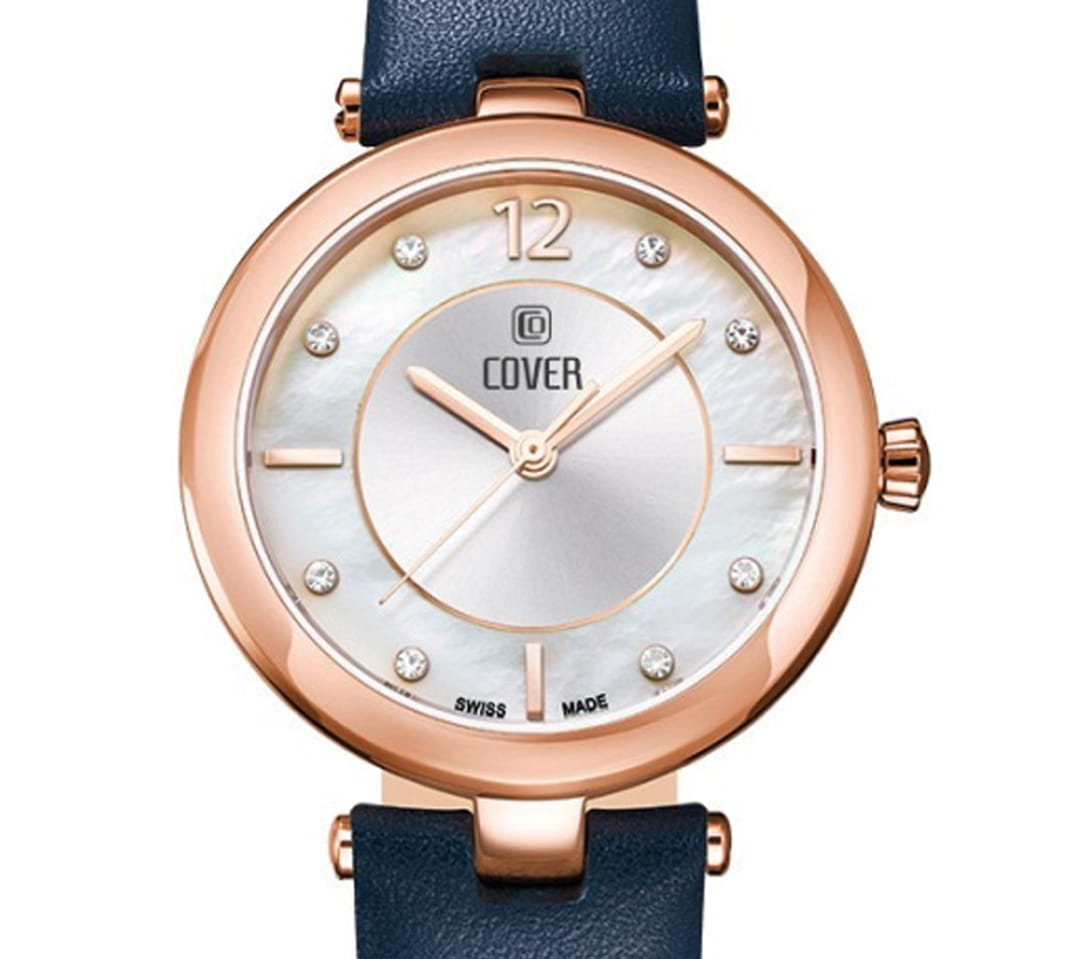 Женственные коктейльные часы COVER CO193.11 из коллекции Amelia работают на кварцевом калибре ETA. Циферблат имеет центральную область серебристого цвета с узором Sunray и белую перламутровую периферийную часть, которые защищены минеральным стекломМинеральное стеклоМинеральное стекло представляет собой искусственно выращенный минерал кварца. Такое стекло отличается особой устойчивостью к повреждениям и царапинам. Уступает по некоторым качествам сапфировому стеклу. с сапфировым напылением. В качестве часовых меток используются 8 кристаллов Swarovski, а также 3 накладных индекса и арабская цифра «12». Корпус 32 мм диаметром выполнен из нержавеющей стали с PVD-покрытиемPVDУльтратонкое покрытие наносится в технике вакуумного напыления, сочетает в себе нитрид титана особой прочности со слоем золота или оксида хрома. Несёт в себе декоративную или защитную функцию. цвета розового золота, с широким полированным безелемБезельВнешний ободок, закрепляющий стекло. В спортивных часах так называется поворотное кольцо с делениями на циферблате, выполняет роль таймера – замеряет отрезки времени на шкале. Неподвижный безель – элемент декора. Однонаправленно вращающийся безель на дайверских часах позволяет фиксировать моменты погружения и выныривания на поверхность.. Часы комплектуются темно-синим кожаным ремешком на стандартной застёжке и имеют маркировку «Swiss Made».