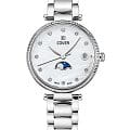 Женские наручные часы Cover CO196.01 из коллекции Fly Me To The Moon представляют собой элегантную модель, сочетающую в себе классический дизайн и современные технологии. Модель обладает круглым корпусом диаметром 32 мм, изготовленным из нержавеющей стали с полированной отделкой. Браслет выполнен из нержавеющей стали серебристого цвета и оснащен раскладной застежкойРаскладной замокДанный вариант застежки используется только на часах с металлическим браслетом. Отличительная особенность такого крепления в том, что длина браслета становится универсальной и вы можете самостоятельно отрегулировать нужный вам размер – застежка просто двигается по браслету часов., обеспечивающей комфортное ношение и безопасность. Циферблат молочно-белого перламутрового цвета украшен 11 кристаллами Swarovski, которые выполняют роль индексов часов, а также имеет окно фаз Луны на «6 часах» и апертуру даты на «3 часах». Для защиты используется стекло с антибликовым покрытием, устойчивое к царапинам. Часы работают на высокоточном кварцевом механизме швейцарского производства, гарантирующем исключительную точность хода без необходимости подзаводки. Водонепроницаемость часов достигает 5 атмосфер (WR 50), что позволяет использовать их в повседневной жизни, включая контакт с водой, но не рекомендуется для плавания или дайвинга. Эти швейцарские часы станут идеальным дополнением как классического, так и повседневного образа женщины, ценящей элегантность и качество.