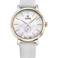 Женские наручные часы Cover CO199.10 из коллекции Cover Pearl Dreams сочетают в себе элегантность и точность швейцарского производства. Модель обладает круглым корпусом диаметром 34 мм, изготовленным из нержавеющей стали с полированным PVD-покрытиемPVDУльтратонкое покрытие наносится в технике вакуумного напыления, сочетает в себе нитрид титана особой прочности со слоем золота или оксида хрома. Несёт в себе декоративную или защитную функцию. золотистого цвета. Ремешок выполнен из белой кожи, на классической застежке для комфортного ношения. Белый перламутровый циферблат украшен лаконичными индексами, секундная стрелка вынесена на субциферблат. Для защиты используется минеральное стеклоМинеральное стеклоМинеральное стекло представляет собой искусственно выращенный минерал кварца. Такое стекло отличается особой устойчивостью к повреждениям и царапинам. Уступает по некоторым качествам сапфировому стеклу. с сапфировым покрытием, обеспечивающее ударопрочность и превосходную читаемость времени. Часы работают на высокоточном кварцевом механизме, гарантирующем исключительную точность хода без необходимости подзаводки. Водонепроницаемость часов достигает 5 атмосфер (WR 50), что позволяет использовать их в повседневной жизни, однако не рекомендуется для контакта с водой во время плавания или дайвинга. Эти швейцарские часы станут идеальным дополнением как классического, так и повседневного образа женщины, ценящей элегантность и качество.