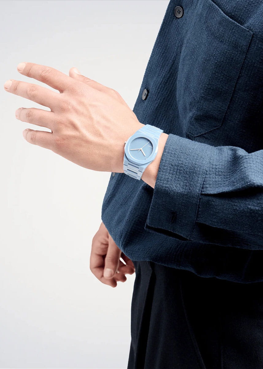 Часы D1 Milano Ceramic Pure Indigo CEBU05 – роскошный аксессуар для современных женщин и мужчин. Кварцевые часы с корпусом из голубой керамики. Минималистичный дизайн циферблата, защищенный прочным сапфировым стекломСапфировое стеклоПрочный и надёжный материал из кристалла сапфира синтетического происхождения, характеризующийся особой твёрдостью и устойчивостью к царапинам и повреждениям. с антибликовым покрытиемАнтибликовое покрытиеСлой оксида металла в 0,13-0,3 микрон, благодаря которому стекло часов не бликует и не отражает свет. Антибликовое покрытие уменьшает отражение света в 10 раз, обеспечивая отличную читаемость показателей циферблата., привлекает внимание своей сдержанной красотой. Циферблат лаконичный, без индексов, с надписью бренда. Изысканные стрелки из латуни с люминесцентным покрытиемЛюминесцентное покрытиеПозволяет считывать показания времени в темноте. Производители наносят на стрелки, часовые индексы, безель или поверхность циферблата светонакопительный состав, дающий холодное свечение.. Стальная задняя крышка с PVD-покрытиемPVDУльтратонкое покрытие наносится в технике вакуумного напыления, сочетает в себе нитрид титана особой прочности со слоем золота или оксида хрома. Несёт в себе декоративную или защитную функцию. закреплена на 4 винтах, что обеспечивает надежность конструкции. Элегантный керамический браслет с застёжкой «бабочка» с кнопкамиЗастёжка "бабочка"Такой вид застёжки дополняется предохранителями, помогающими избежать случайного раскрытия браслета. Обладают изящным исполнением. . Водозащита 50 метров защищает часы от брызг и дождя, делая их подходящими для повседневного использования. Часы сочетают в себе классический дизайн и современные технологии производства.