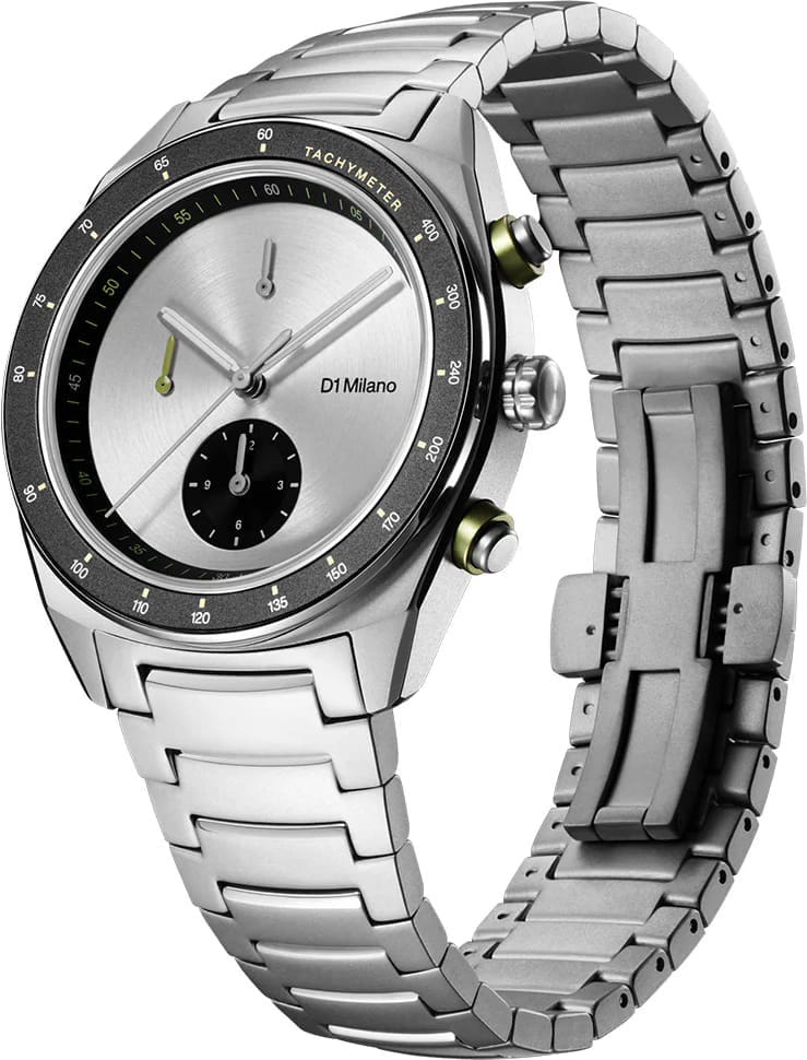 Элегантный хронограф D1 Milano Cronografo Essential White CHBJ20 - идеальное воплощение мужественности и стиля. Этот многофункциональный аксессуар оснащен секундомером, тахиметромТахиметрРазмеченная шкала, располагается на ободке или безеле часов. Тахиметр позволяет рассчитать скорость на определённом участке пути, расстояние измеряется в километрах или милях.. что делает его незаменимым компаньоном в повседневной жизни. Изысканный корпус и браслет выполнены из стали. Неподвижный безельБезельВнешний ободок, закрепляющий стекло. В спортивных часах так называется поворотное кольцо с делениями на циферблате, выполняет роль таймера – замеряет отрезки времени на шкале. Неподвижный безель – элемент декора. Однонаправленно вращающийся безель на дайверских часах позволяет фиксировать моменты погружения и выныривания на поверхность. из нержавеющей стали с PVD-покрытиемPVDУльтратонкое покрытие наносится в технике вакуумного напыления, сочетает в себе нитрид титана особой прочности со слоем золота или оксида хрома. Несёт в себе декоративную или защитную функцию.. Минималистичный дизайн циферблата, защищенный прочным сапфировым стекломСапфировое стеклоПрочный и надёжный материал из кристалла сапфира синтетического происхождения, характеризующийся особой твёрдостью и устойчивостью к царапинам и повреждениям. с антибликовым покрытиемАнтибликовое покрытиеСлой оксида металла в 0,13-0,3 микрон, благодаря которому стекло часов не бликует и не отражает свет. Антибликовое покрытие уменьшает отражение света в 10 раз, обеспечивая отличную читаемость показателей циферблата., привлекает внимание своей сдержанной красотой. Стрелки с люминесцентным покрытиемЛюминесцентное покрытиеПозволяет считывать показания времени в темноте. Производители наносят на стрелки, часовые индексы, безель или поверхность циферблата светонакопительный состав, дающий холодное свечение., обеспечивающим хорошую читаемость в темноте. Надежная конструкция с задней крышкой на 8 винтах и стильный браслет с удобной застёжкой «бабочка» с кнопкамиЗастёжка "бабочка"Такой вид застёжки дополняется предохранителями, помогающими избежать случайного раскрытия браслета. Обладают изящным исполнением. обеспечивают комфорт при ношении. Водозащита 50 метров защищает часы от брызг и дождя, делая их подходящими для повседневного использования. Это не просто часы, а статусный аксессуар, подчеркивающий безупречный вкус и внимание к деталям своего владельца.