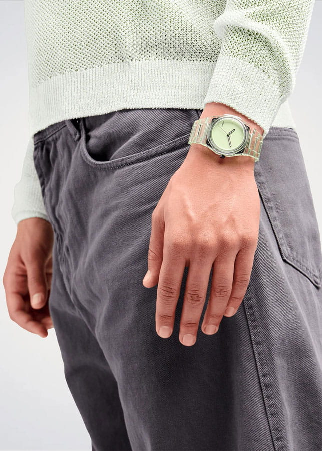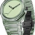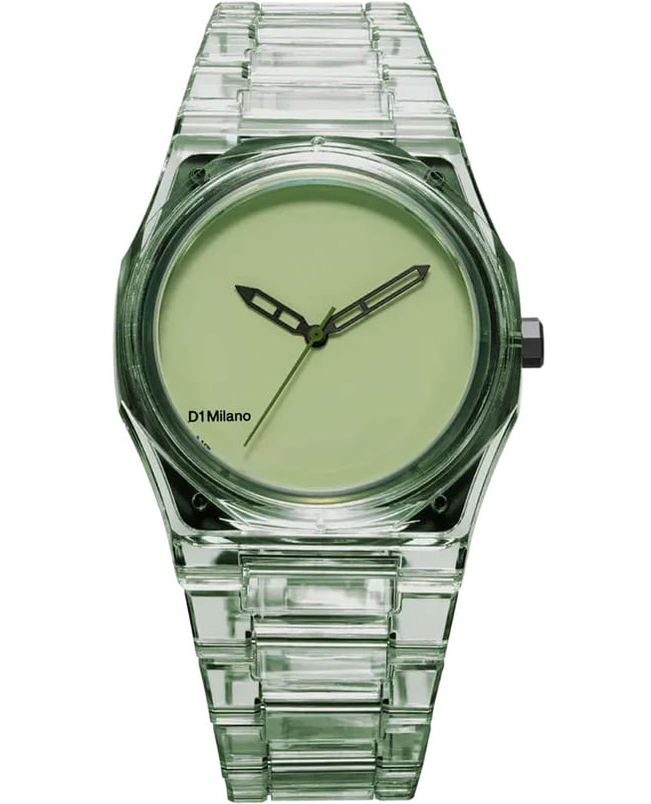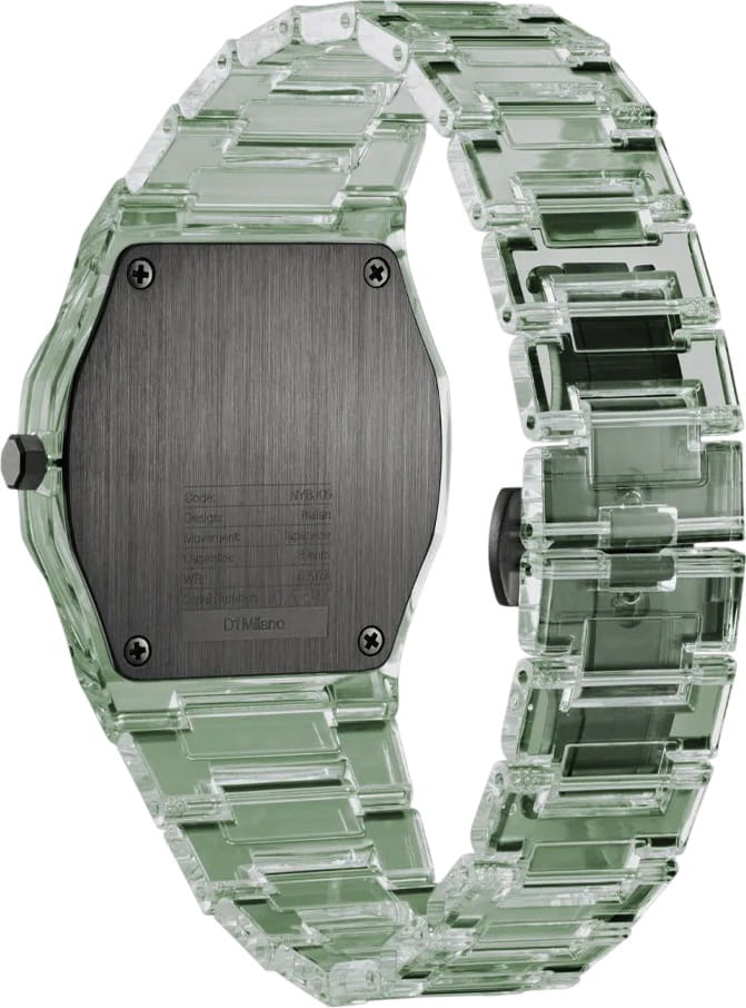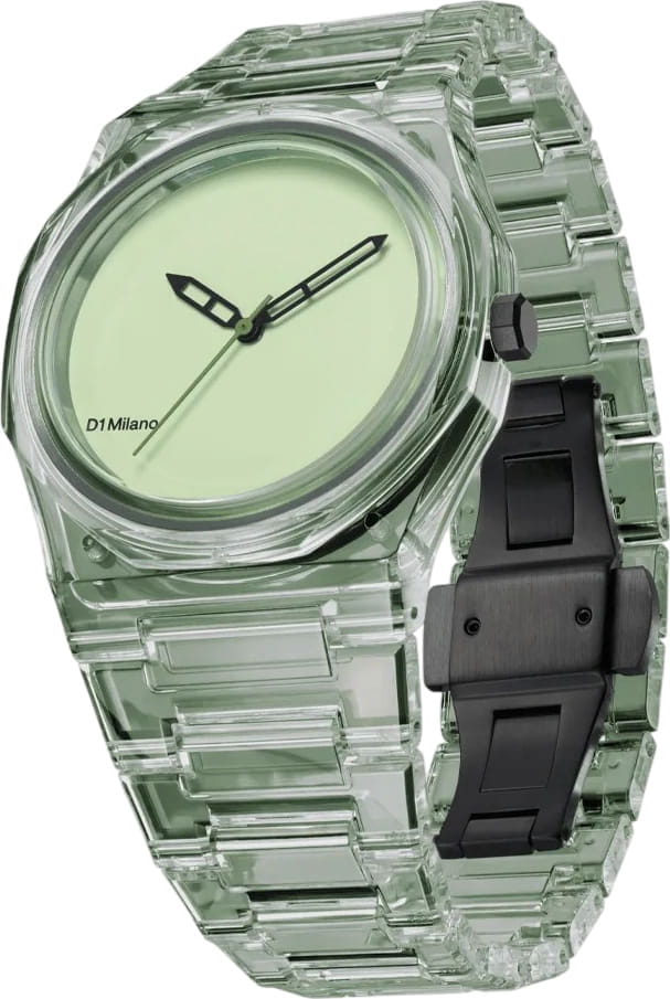 Часы D1 Milano Nylon Exp_Mint NYBJ04 – модный и стильный аксессуар-унисекс лаконичного дизайна. Часы работают на кварцевом механизме, обеспечивающем точность хода. Циферблат защищён минеральным стекломМинеральное стеклоМинеральное стекло представляет собой искусственно выращенный минерал кварца. Такое стекло отличается особой устойчивостью к повреждениям и царапинам. Уступает по некоторым качествам сапфировому стеклу. с антибликовым покрытиемАнтибликовое покрытиеСлой оксида металла в 0,13-0,3 микрон, благодаря которому стекло часов не бликует и не отражает свет. Антибликовое покрытие уменьшает отражение света в 10 раз, обеспечивая отличную читаемость показателей циферблата., устойчивым к царапинам, хорошо может выдержать небольшие удары и падения. Изысканный корпус выполнен из прозрачного зеленого нейлона. Зеленый матовый циферблат без индексов. Лаконичные стрелки-скелетон выполнены из латуни. Задняя крышка из стали с черным PVD-покрытиемPVDУльтратонкое покрытие наносится в технике вакуумного напыления, сочетает в себе нитрид титана особой прочности со слоем золота или оксида хрома. Несёт в себе декоративную или защитную функцию. закреплена на 4 винтах. Ремешок из нейлона имеет застёжку «бабочка» с кнопкамиЗастёжка "бабочка"Такой вид застёжки дополняется предохранителями, помогающими избежать случайного раскрытия браслета. Обладают изящным исполнением. . Водозащита 50 метров защищает часы от брызг и дождя, делая их подходящими для повседневного использования. Идеальный выбор для тех, кто ценит лаконичный стиль, точность и надёжность.