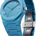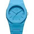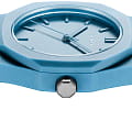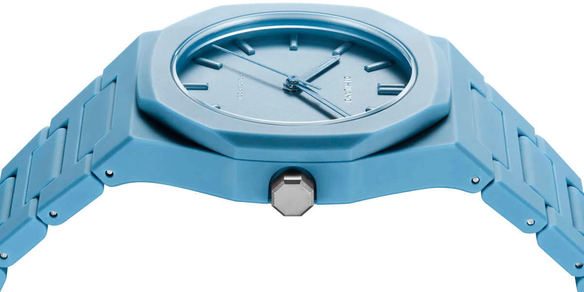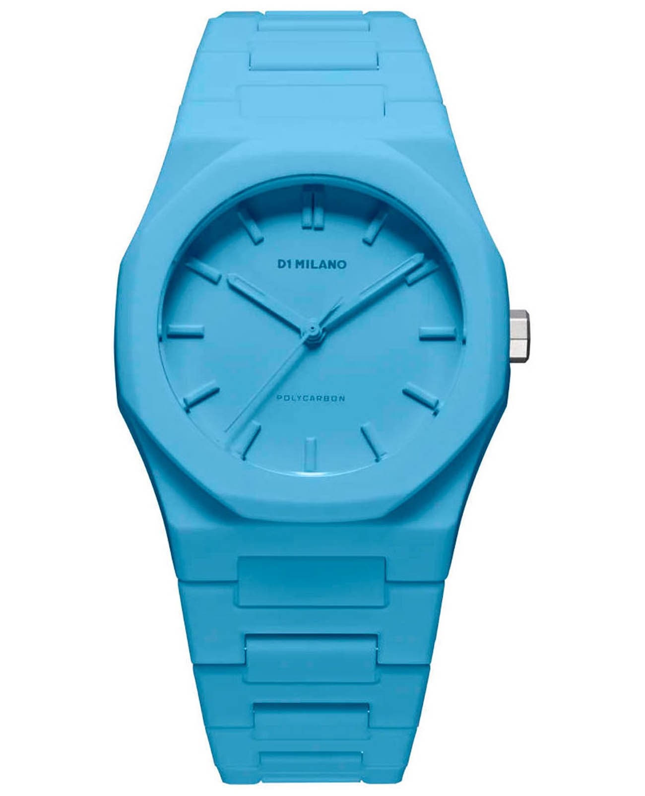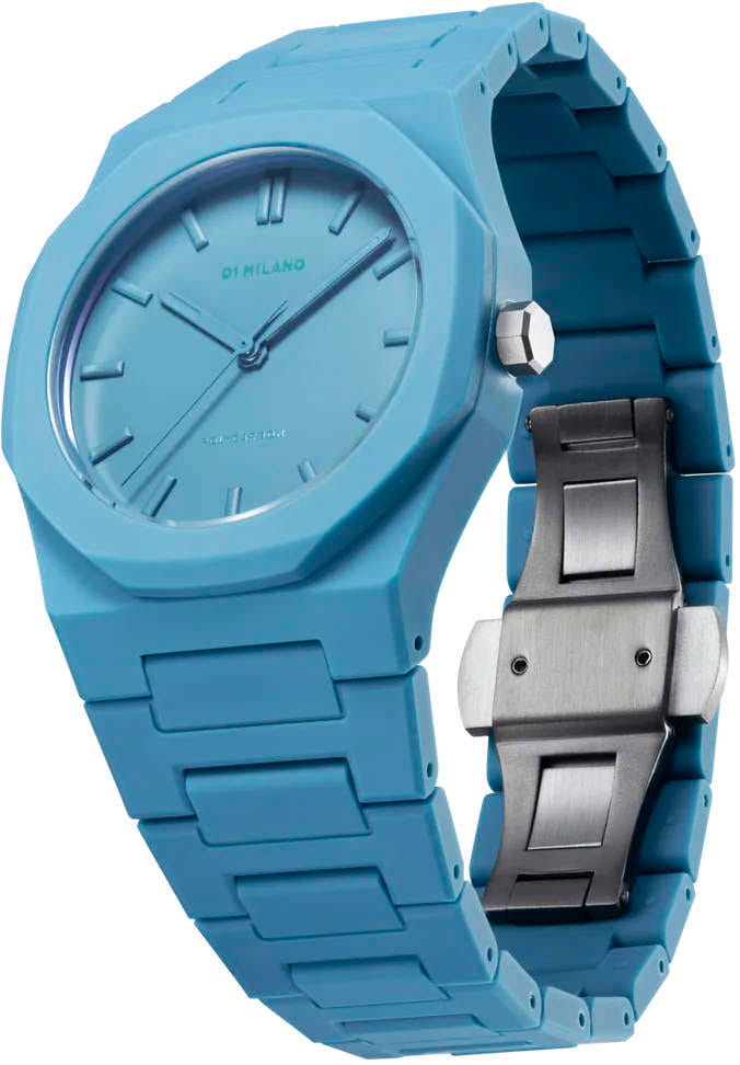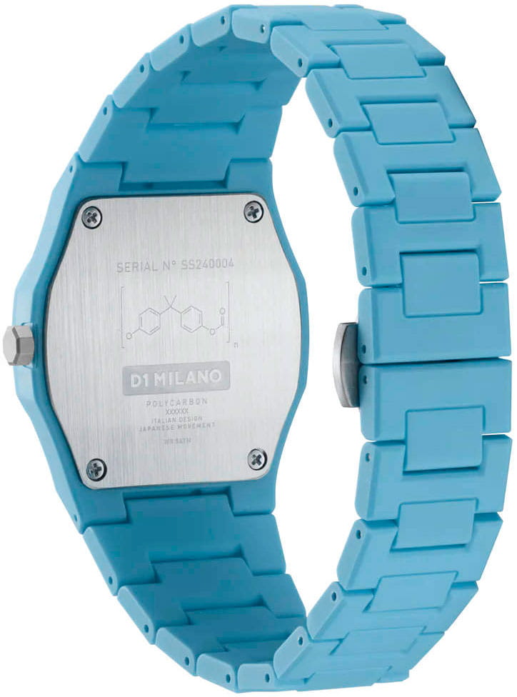 Часы D1 Milano Polycarbon PCBU04 – молодежные часы в стиле унисекс для повседневных образов, стильные и комфортные. Модель Powder Blue имеет голубой корпус и браслет из поликарбоната с покрытием Софт-Тач.. Циферблат лаконичный с индексами в виде штрихов, защищен минеральным стекломМинеральное стеклоМинеральное стекло представляет собой искусственно выращенный минерал кварца. Такое стекло отличается особой устойчивостью к повреждениям и царапинам. Уступает по некоторым качествам сапфировому стеклу. с антибликовым покрытием. Стальная задняя крышка на 4 винтах. Пластиковый браслет на застёжке «бабочка» с кнопкамиЗастёжка "бабочка"Такой вид застёжки дополняется предохранителями, помогающими избежать случайного раскрытия браслета. Обладают изящным исполнением. .