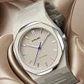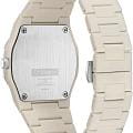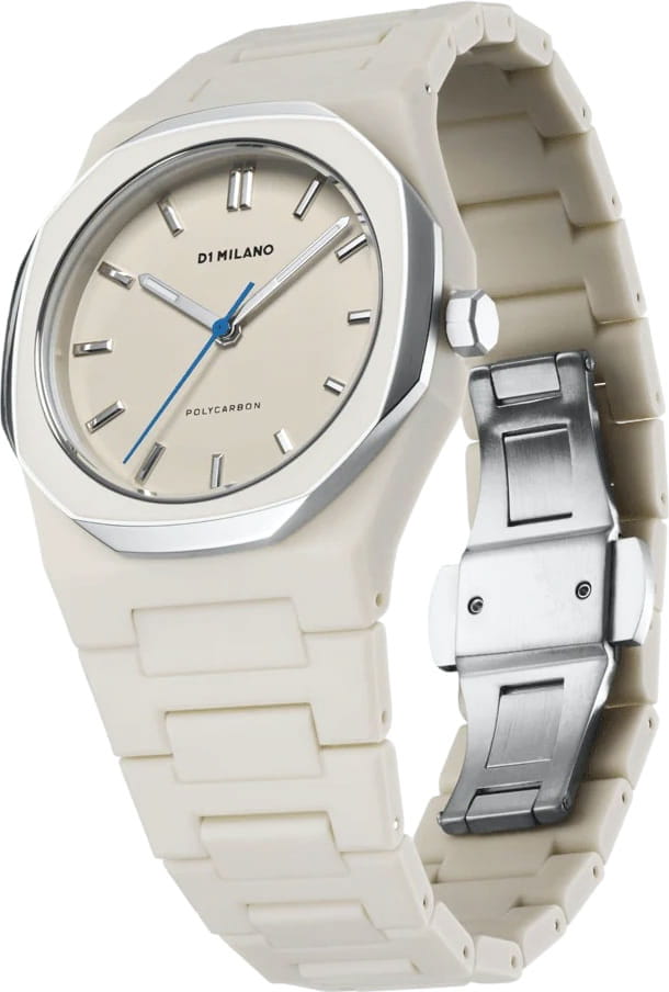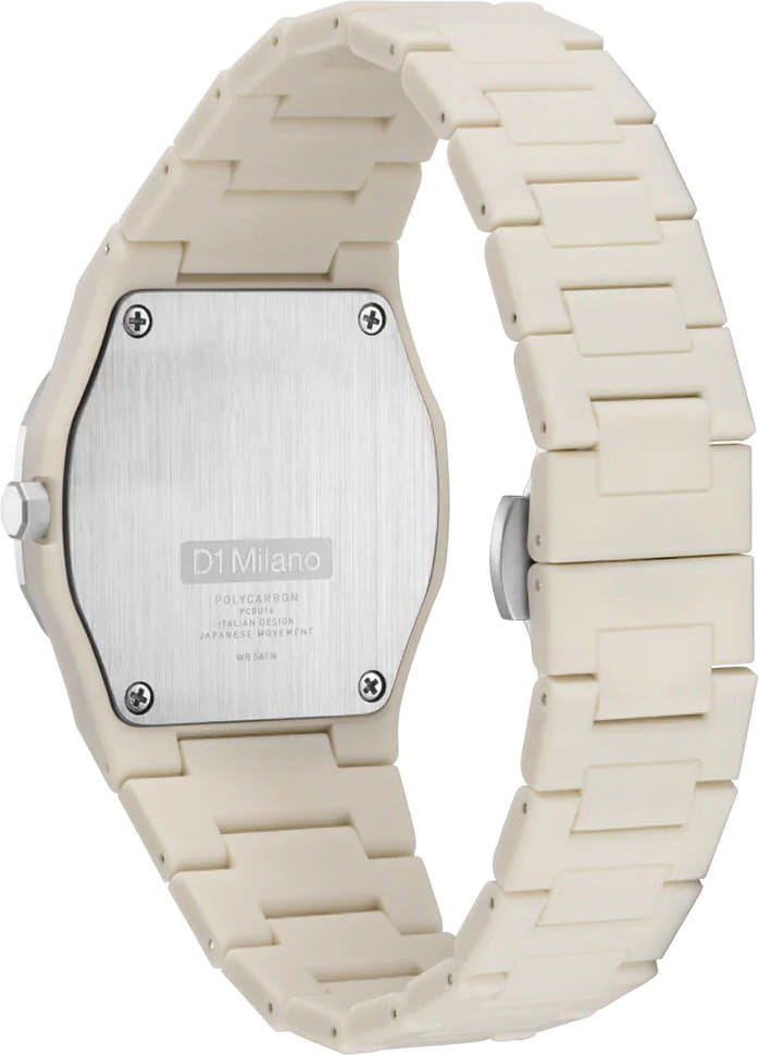 Часы D1 Milano Polycarbon Grey Mesh PCBU16 – современные часы для повседневных образов. Модель имеет серо-бежевый корпус из поликарбоната с покрытием Софт-Тач и полированный стальной безельБезельВнешний ободок, закрепляющий стекло. В спортивных часах так называется поворотное кольцо с делениями на циферблате, выполняет роль таймера – замеряет отрезки времени на шкале. Неподвижный безель – элемент декора. Однонаправленно вращающийся безель на дайверских часах позволяет фиксировать моменты погружения и выныривания на поверхность. с эмалью. Циферблат матовый и лаконичный с индексами в виде штрихов, защищен минеральным стекломМинеральное стеклоМинеральное стекло представляет собой искусственно выращенный минерал кварца. Такое стекло отличается особой устойчивостью к повреждениям и царапинам. Уступает по некоторым качествам сапфировому стеклу. с антибликовым покрытиемАнтибликовое покрытиеСлой оксида металла в 0,13-0,3 микрон, благодаря которому стекло часов не бликует и не отражает свет. Антибликовое покрытие уменьшает отражение света в 10 раз, обеспечивая отличную читаемость показателей циферблата.. Изысканные стрелки выполнены из латуни с люминесцентным покрытиемЛюминесцентное покрытиеПозволяет считывать показания времени в темноте. Производители наносят на стрелки, часовые индексы, безель или поверхность циферблата светонакопительный состав, дающий холодное свечение., гармонично дополняющим общий дизайн модели. Задняя крышка закреплена на 4 винтах, что обеспечивает надежность конструкции. Элегантный пластиковый браслет с покрытием Софт-Тач на застёжке-бабочкеЗастёжка "бабочка"Такой вид застёжки дополняется предохранителями, помогающими избежать случайного раскрытия браслета. Обладают изящным исполнением. . Водозащита 50 метров защищает часы от брызг и дождя, делая их подходящими для повседневного использования. D1 Milano – для тех, кто умеет ценить индивидуальность.