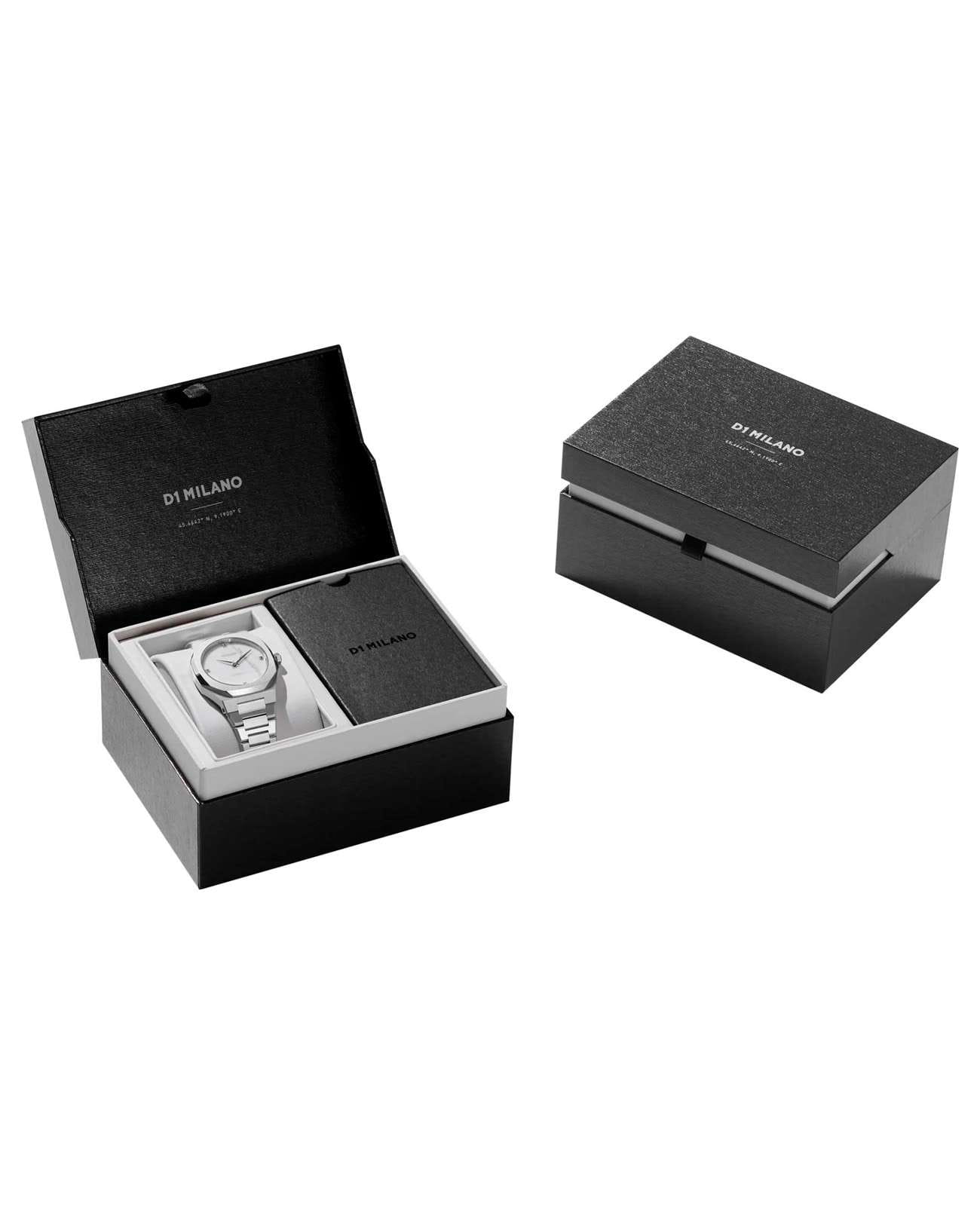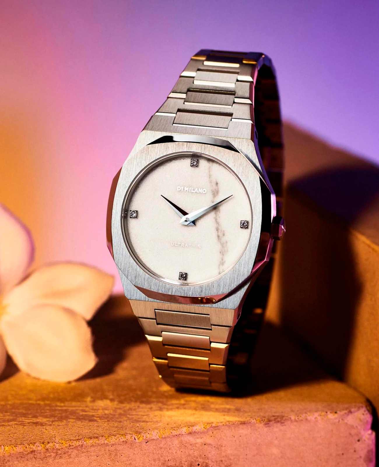 Женские наручные часы D1 Milano UTBL13 из коллекции Ultra Thin сочетают в себе элегантный дизайн и современные технологии. Модель обладает круглым корпусом диаметром 34 мм, изготовленным из высококачественной нержавеющей стали. Толщина ультратонкого корпуса составляет всего 6 мм, что делает аксессуар легким и удобным для повседневного использования. Браслет также выполнен из нержавеющей стали с раскладной застежкойРаскладной замокДанный вариант застежки используется только на часах с металлическим браслетом. Отличительная особенность такого крепления в том, что длина браслета становится универсальной и вы можете самостоятельно отрегулировать нужный вам размер – застежка просто двигается по браслету часов., гарантирующей комфортное ношение и безопасность. Циферблат белого и серого мраморного цвета украшен метками в виде кристаллов и оснащен стрелочным механизмом, который подчеркивает элегантность модели. Для защиты используется сапфировое стеклоСапфировое стеклоПрочный и надёжный материал из кристалла сапфира синтетического происхождения, характеризующийся особой твёрдостью и устойчивостью к царапинам и повреждениям. с антибликовым покрытиемАнтибликовое покрытиеСлой оксида металла в 0,13-0,3 микрон, благодаря которому стекло часов не бликует и не отражает свет. Антибликовое покрытие уменьшает отражение света в 10 раз, обеспечивая отличную читаемость показателей циферблата., обеспечивающее прочную защиту от царапин и бликов. Часы работают на кварцевом механизме, гарантирующем точность хода без необходимости регулярного подзавода. Водонепроницаемость часов достигает 5 атмосфер (50 метров), что позволяет использовать их во время мытья рук или плавания, однако не рекомендуется для глубоководного дайвинга.