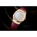Женские наручные часы из коллекции Ultra Thin сочетают в себе элегантный дизайн и надежность современных технологий. Модель обладает круглым корпусом диаметром 38 мм, выполненным из высококачественной нержавеющей стали с PVD-покрытиемPVDУльтратонкое покрытие наносится в технике вакуумного напыления, сочетает в себе нитрид титана особой прочности со слоем золота или оксида хрома. Несёт в себе декоративную или защитную функцию., что обеспечивает устойчивость к внешним воздействиям. Толщина корпуса составляет всего 6 мм, что делает часы ультратонкими и комфортными для повседневного использования. Циферблат белого цвета украшен стрелками и индексами золотистого оттенка, создавая гармоничный и стильный образ. Защиту циферблата обеспечивает минеральное стеклоМинеральное стеклоМинеральное стекло представляет собой искусственно выращенный минерал кварца. Такое стекло отличается особой устойчивостью к повреждениям и царапинам. Уступает по некоторым качествам сапфировому стеклу. с антибликовым покрытиемАнтибликовое покрытиеСлой оксида металла в 0,13-0,3 микрон, благодаря которому стекло часов не бликует и не отражает свет. Антибликовое покрытие уменьшает отражение света в 10 раз, обеспечивая отличную читаемость показателей циферблата., известное своей устойчивостью к царапинам и высокой прозрачностью. Часы оснащены кварцевым механизмом Miyota 1L22, гарантирующим точность хода без необходимости подзаводки. Ремешок выполнен из натуральной кожи сливового цвета, что обеспечивает комфортное ношение на протяжении всего дня. Водонепроницаемость модели составляет 5 атмосфер (50 метров), что позволяет использовать часы в повседневной жизни, включая контакт с водой при мытье рук или дожде, однако не рекомендуется для погружений или активных водных видов спорта. Изготовленные в Италии, эти часы станут стильным аксессуаром, идеально дополняющим как деловой, так и casual-образ.