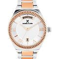 Женские кварцевые часы Daniel Klein — это оригинальный и функциональный аксессуар. Корпус диаметром 35 мм выполнен из нержавеющей стали. БезельБезельВнешний ободок, закрепляющий стекло. В спортивных часах так называется поворотное кольцо с делениями на циферблате, выполняет роль таймера – замеряет отрезки времени на шкале. Неподвижный безель – элемент декора. Однонаправленно вращающийся безель на дайверских часах позволяет фиксировать моменты погружения и выныривания на поверхность. с IP-покрытиемIP-покрытиеМетод ионного напыления. Демонстрирует повышенную устойчивость к истиранию, окислению и химическим веществам. Под воздействием высокого давления и температуры около 1500°C молекулы металла надёжно соединяются с частицами корпуса часов. декорирован узором. Циферблат белого цвета имеет гильошированную центральную часть и зону меток, выполненную по технологии Sunray («солнечные лучи»). Индексы представлены штрихами и римскими цифрами. Окошко дня недели расположено в положении 12 часов, окошко даты — в положении 6 часов. Стрелки с люминесцентным покрытиемЛюминесцентное покрытиеПозволяет считывать показания времени в темноте. Производители наносят на стрелки, часовые индексы, безель или поверхность циферблата светонакопительный состав, дающий холодное свечение., обеспечивающим хорошую читаемость в темноте. Циферблат защищён минеральным стекломМинеральное стеклоМинеральное стекло представляет собой искусственно выращенный минерал кварца. Такое стекло отличается особой устойчивостью к повреждениям и царапинам. Уступает по некоторым качествам сапфировому стеклу.. Заводная головка рифлёная, с защитой. Часы оснащены стальным браслетом с частичным IP-покрытиемIP-покрытиеМетод ионного напыления. Демонстрирует повышенную устойчивость к истиранию, окислению и химическим веществам. Под воздействием высокого давления и температуры около 1500°C молекулы металла надёжно соединяются с частицами корпуса часов. на раскладной застёжкеРаскладная застёжкаТакой тип застёжки используется только на браслетах из металла. Она никогда не раскрывается полностью, происходит разделение на 2 и более частей. Раскладывающая застёжка снизит вероятность потери часов к минимуму.. Водонепроницаемость 30 м позволяет использовать часы в повседневных условиях. Идеальный выбор для тех, кто ценит турецкое качество и универсальный дизайн.