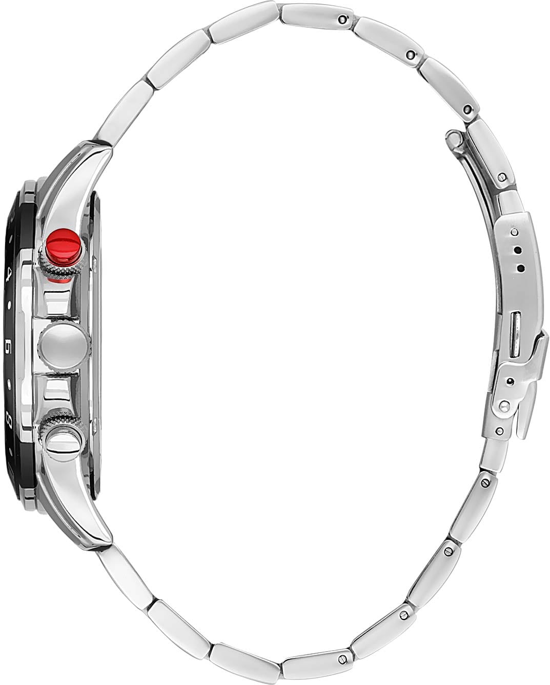 Мужские кварцевые часы Daniel Klein — это эффектный и функциональный аксессуар. Корпус диаметром 45 мм выполнен из нержавеющей стали. БезельБезельВнешний ободок, закрепляющий стекло. В спортивных часах так называется поворотное кольцо с делениями на циферблате, выполняет роль таймера – замеряет отрезки времени на шкале. Неподвижный безель – элемент декора. Однонаправленно вращающийся безель на дайверских часах позволяет фиксировать моменты погружения и выныривания на поверхность. с PVD-покрытиемPVDУльтратонкое покрытие наносится в технике вакуумного напыления, сочетает в себе нитрид титана особой прочности со слоем золота или оксида хрома. Несёт в себе декоративную или защитную функцию. изготовлен из алюминия. Циферблат чёрного цвета оформлен штрихами, стрелками и секундной шкалой по краю циферблата (шаг 0,2 сек). Присутствуют отдельные индикаторы дня недели и даты, а также 24-часовой формат времени. Стрелки с люминесцентным покрытиемЛюминесцентное покрытиеПозволяет считывать показания времени в темноте. Производители наносят на стрелки, часовые индексы, безель или поверхность циферблата светонакопительный состав, дающий холодное свечение., обеспечивающим хорошую читаемость в темноте. Циферблат защищён минеральным стекломМинеральное стеклоМинеральное стекло представляет собой искусственно выращенный минерал кварца. Такое стекло отличается особой устойчивостью к повреждениям и царапинам. Уступает по некоторым качествам сапфировому стеклу.. Заводная головка с защитой повышает надёжность. Часы оснащены частично полированным и сатинированным стальным браслетом на раскладной застёжкеРаскладная застёжкаТакой тип застёжки используется только на браслетах из металла. Она никогда не раскрывается полностью, происходит разделение на 2 и более частей. Раскладывающая застёжка снизит вероятность потери часов к минимуму.. Водонепроницаемость 50 м позволяет использовать часы в повседневных условиях. Идеальный выбор для тех, кто ценит турецкое качество и универсальный дизайн.