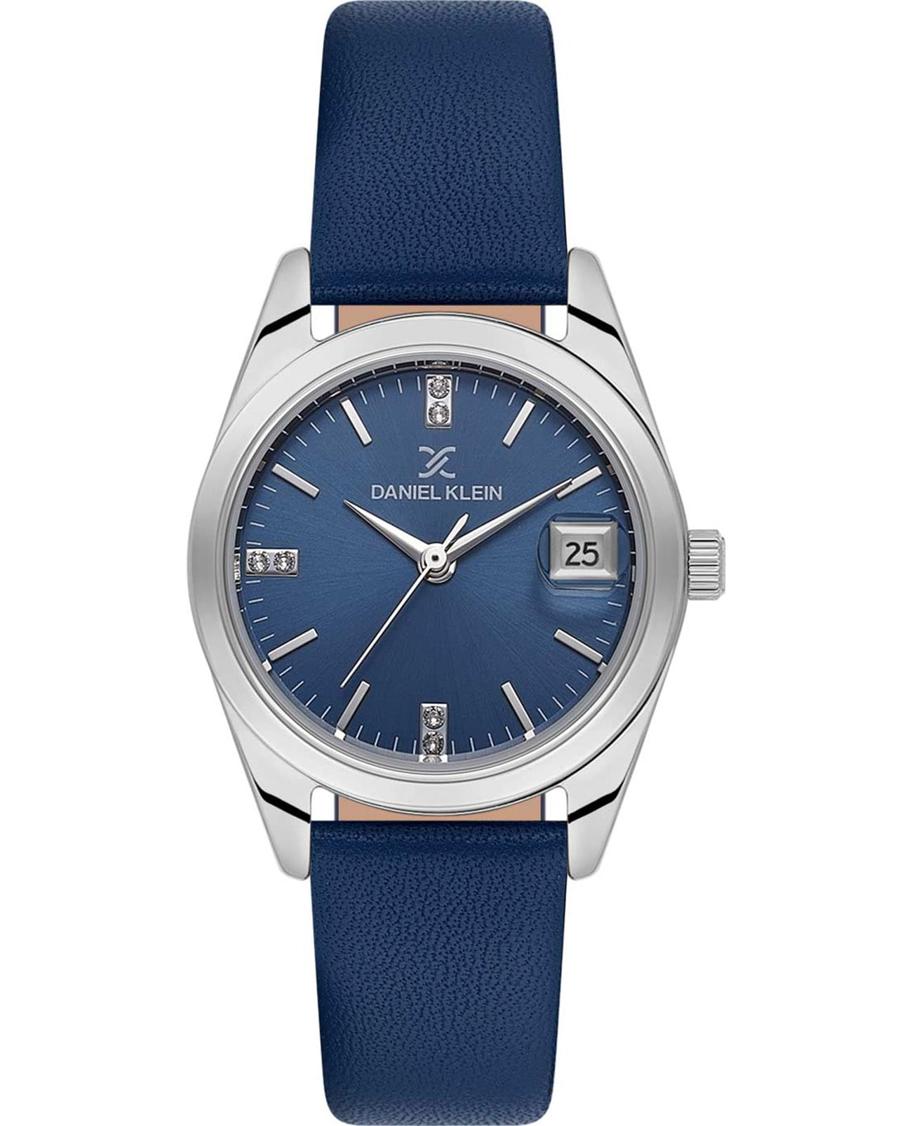 Женские кварцевые часы Daniel Klein — это эффектный аксессуар для современной женщины. Корпус диаметром 28 мм выполнен из нержавеющей стали. Циферблат синего цвета выполнен по технологии Sunray («солнечные лучи») и оформлен штрихами с кристаллами и стрелками. Окошко даты расположено в положении 3 часов и оснащено увеличительным стеклом (Cyclops). Циферблат защищён минеральным стекломМинеральное стеклоМинеральное стекло представляет собой искусственно выращенный минерал кварца. Такое стекло отличается особой устойчивостью к повреждениям и царапинам. Уступает по некоторым качествам сапфировому стеклу.. Часы оснащены кожаным ремешком на классической пряжке. Водонепроницаемость 30 м позволяет использовать часы в повседневных условиях. Идеальный выбор для тех, кто ценит турецкое качество и элегантный дизайн.