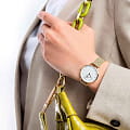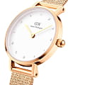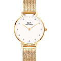 Женские наручные часы с минеральным стекломМинеральное стеклоМинеральное стекло представляет собой искусственно выращенный минерал кварца. Такое стекло отличается особой устойчивостью к повреждениям и царапинам. Уступает по некоторым качествам сапфировому стеклу. Daniel Wellington Petite DW00100604, кварцевый механизм с высокой точностью. Корпус часов изготовлен из стали с PVD-покрытиемPVDУльтратонкое покрытие наносится в технике вакуумного напыления, сочетает в себе нитрид титана особой прочности со слоем золота или оксида хрома. Несёт в себе декоративную или защитную функцию.. Циферблат украшен 12 кристаллами Swarovski. Класс водозащиты: 30 метров, позволит защитить корпус от случайных брызг или капель дождя. Стальной браслет миланского плетения с PVD-покрытиемPVDУльтратонкое покрытие наносится в технике вакуумного напыления, сочетает в себе нитрид титана особой прочности со слоем золота или оксида хрома. Несёт в себе декоративную или защитную функцию. на раскладном замкеРаскладной замокДанный вариант застежки используется только на часах с металлическим браслетом. Отличительная особенность такого крепления в том, что длина браслета становится универсальной и вы можете самостоятельно отрегулировать нужный вам размер – застежка просто двигается по браслету часов..