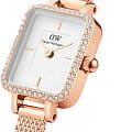 Женские наручные часы с минеральным стекломМинеральное стеклоМинеральное стекло представляет собой искусственно выращенный минерал кварца. Такое стекло отличается особой устойчивостью к повреждениям и царапинам. Уступает по некоторым качествам сапфировому стеклу. Daniel Wellington Quadro Mini Lumine Bezel Rose Gold DW00100731, кварцевый механизм с высокой точностью. Корпус часов изготовлен из нержавеющей стали с PVD-покрытиемPVDУльтратонкое покрытие наносится в технике вакуумного напыления, сочетает в себе нитрид титана особой прочности со слоем золота или оксида хрома. Несёт в себе декоративную или защитную функцию.. Накладные метки в виде штрихов. Японский кварцевый механизм. Рифленая заводная головка. Класс водозащиты: 30 метров, позволит защитить корпус от случайных брызг или капель дождя. Стальной браслет миланского плетения на раскладном замкеРаскладной замокДанный вариант застежки используется только на часах с металлическим браслетом. Отличительная особенность такого крепления в том, что длина браслета становится универсальной и вы можете самостоятельно отрегулировать нужный вам размер – застежка просто двигается по браслету часов. с PVD-покрытиемPVDУльтратонкое покрытие наносится в технике вакуумного напыления, сочетает в себе нитрид титана особой прочности со слоем золота или оксида хрома. Несёт в себе декоративную или защитную функцию.. БезельБезельВнешний ободок, закрепляющий стекло. В спортивных часах так называется поворотное кольцо с делениями на циферблате, выполняет роль таймера – замеряет отрезки времени на шкале. Неподвижный безель – элемент декора. Однонаправленно вращающийся безель на дайверских часах позволяет фиксировать моменты погружения и выныривания на поверхность. инкрустирован кристаллами.