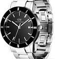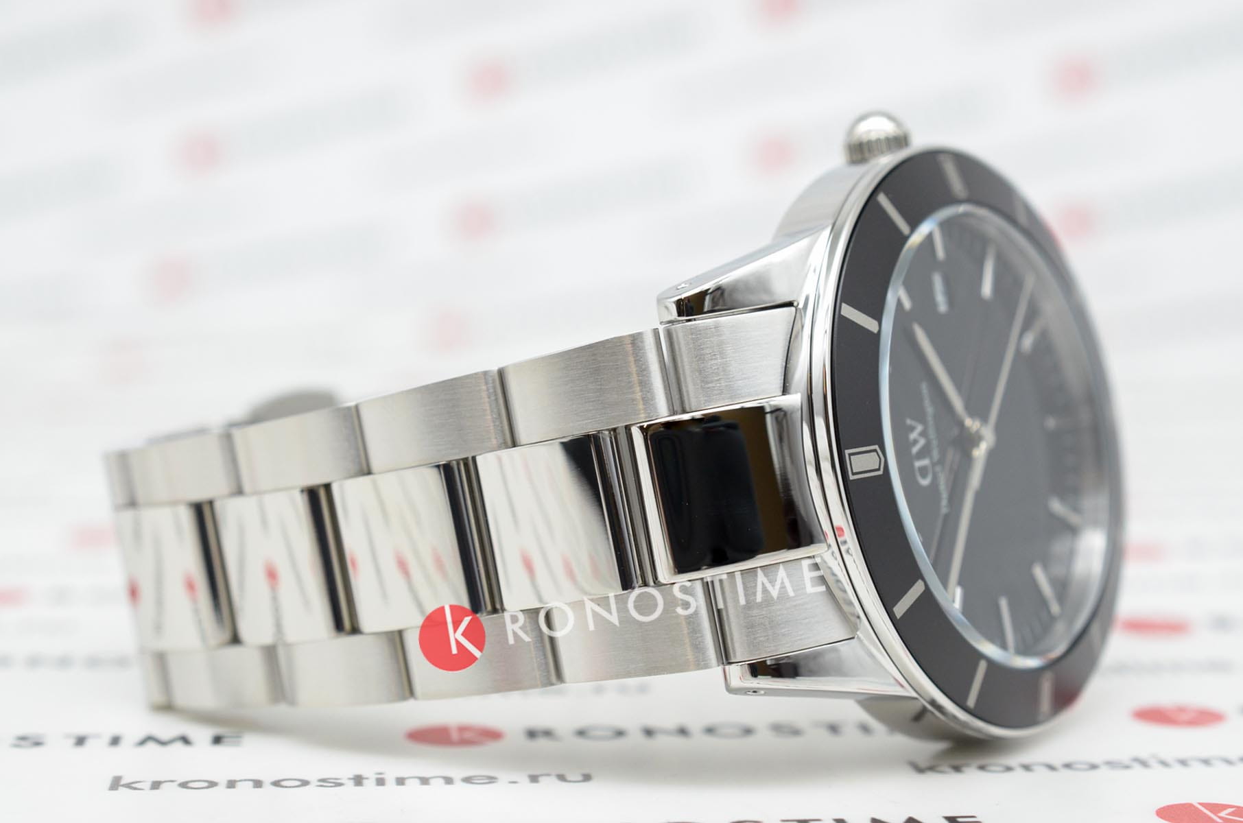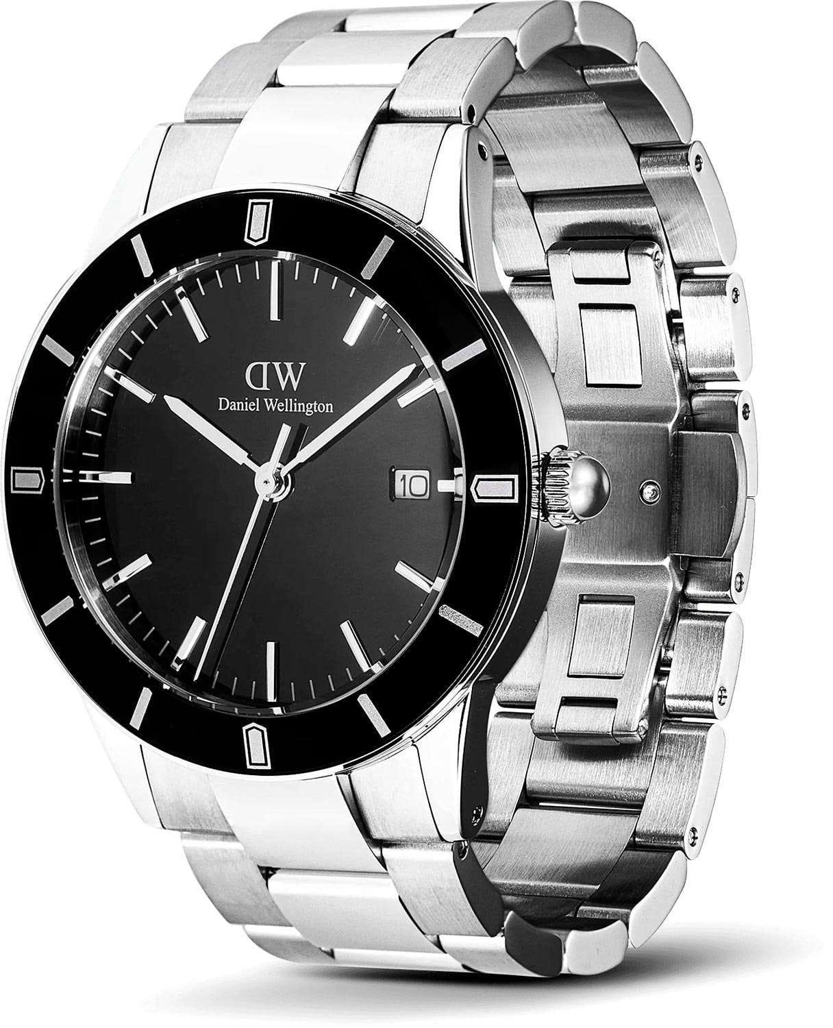 Daniel Wellington — мужские часы в современном спортивно-элегантном стиле. Круглый корпус диаметром 40 мм изготовлен из нержавеющей стали и дополнен чёрным безелемБезельВнешний ободок, закрепляющий стекло. В спортивных часах так называется поворотное кольцо с делениями на циферблате, выполняет роль таймера – замеряет отрезки времени на шкале. Неподвижный безель – элемент декора. Однонаправленно вращающийся безель на дайверских часах позволяет фиксировать моменты погружения и выныривания на поверхность. из анодированного алюминия, которое придаёт модели выразительный характер.