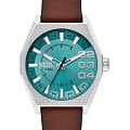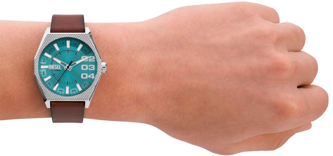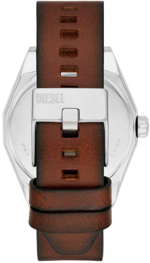 Мужские наручные часы с минеральным стекломМинеральное стеклоМинеральное стекло представляет собой искусственно выращенный минерал кварца. Такое стекло отличается особой устойчивостью к повреждениям и царапинам. Уступает по некоторым качествам сапфировому стеклу. Diesel Scraper DZ2174, кварцевый механизм с высокой точностью. Класс водозащиты: 50 метров, позволит защитить корпус от случайных брызг или капель дождя. Круглый корпус часов изготовлен из стали. Кожаный ремешок на стандартной застёжке. Метки в виде штрихов и арабских цифр. Циферблат выполнен по технологии Sunray (солнечные лучи). Стрелки и метки с люминесцентным покрытиемЛюминесцентное покрытиеПозволяет считывать показания времени в темноте. Производители наносят на стрелки, часовые индексы, безель или поверхность циферблата светонакопительный состав, дающий холодное свечение..