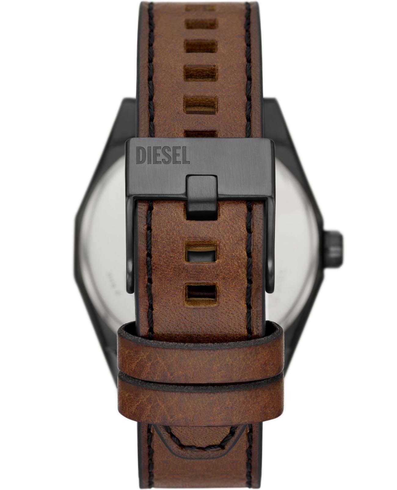 Мужские наручные часы с минеральным стекломМинеральное стеклоМинеральное стекло представляет собой искусственно выращенный минерал кварца. Такое стекло отличается особой устойчивостью к повреждениям и царапинам. Уступает по некоторым качествам сапфировому стеклу. Diesel Scraper DZ2189, кварцевый механизм с высокой точностью. Класс водозащиты: 50 метров, позволит защитить корпус от случайных брызг или капель дождя. Корпус часов изготовлен из нержавеющей стали с IP-покрытиемIP-покрытиеМетод ионного напыления. Демонстрирует повышенную устойчивость к истиранию, окислению и химическим веществам. Под воздействием высокого давления и температуры около 1500°C молекулы металла надёжно соединяются с частицами корпуса часов.. Кожаный ремешок на стандартной застёжке. Метки в виде штрихов и арабских цифр. Циферблат выполнен по технологии Sunray (солнечные лучи). Стрелки и метки с люминесцентным покрытиемЛюминесцентное покрытиеПозволяет считывать показания времени в темноте. Производители наносят на стрелки, часовые индексы, безель или поверхность циферблата светонакопительный состав, дающий холодное свечение..
