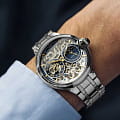 Мужские наручные часы с минеральным стекломМинеральное стеклоМинеральное стекло представляет собой искусственно выращенный минерал кварца. Такое стекло отличается особой устойчивостью к повреждениям и царапинам. Уступает по некоторым качествам сапфировому стеклу. Earnshaw Barallier ES-8242-33, механический механизм с автоподзаводом. Класс водозащиты: 30 метров, позволит защитить корпус от случайных брызг или капель дождя. Скелетонизированный циферблат. Центральные часовая и минутная стрелки. 12/24х часовой формат времени. Индикатор день/ночь. Циферблат с часовыми индексами в виде штрихов и цифр. Корпус выполнен из нержавеющей стали. Диаметр корпуса 42 мм, толщина 15 мм. Раскладная застёжкаРаскладная застёжкаТакой тип застёжки используется только на браслетах из металла. Она никогда не раскрывается полностью, происходит разделение на 2 и более частей. Раскладывающая застёжка снизит вероятность потери часов к минимуму.