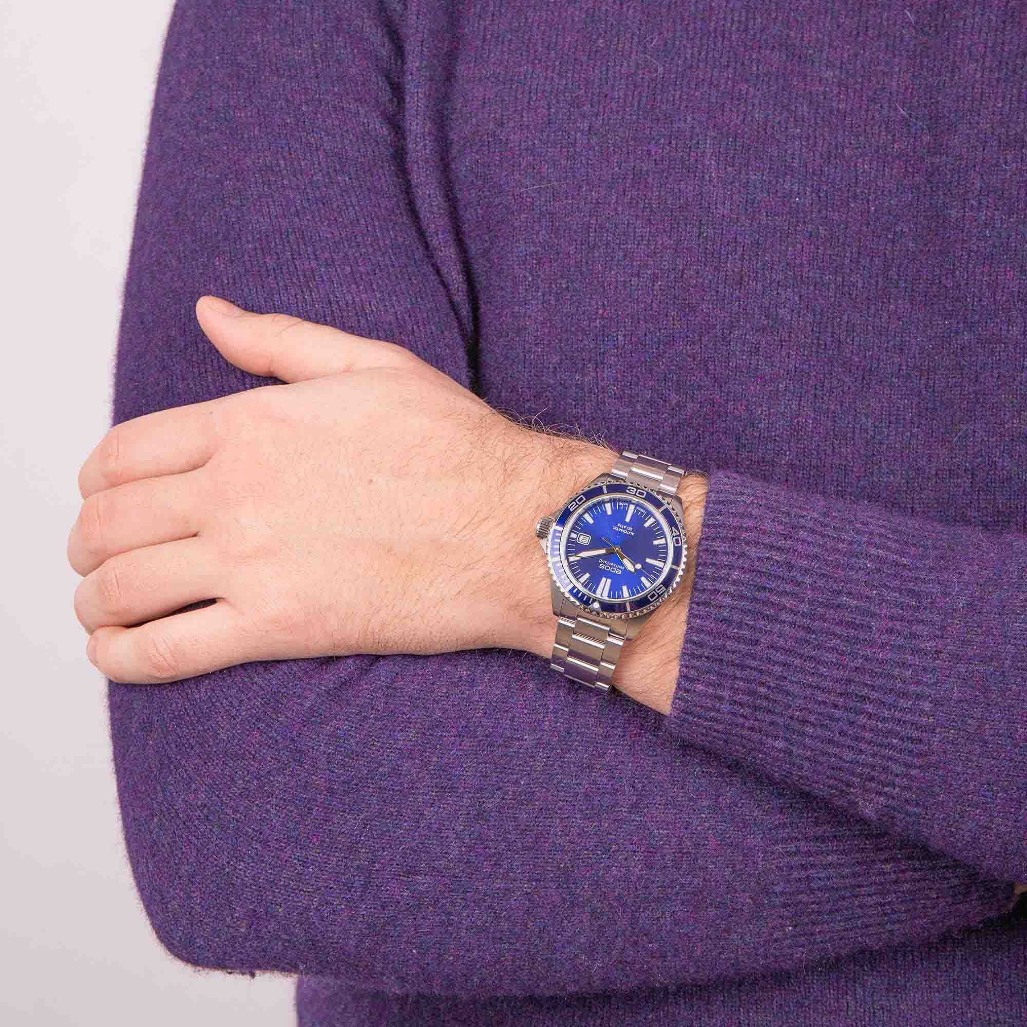 Мужские механические часы с автоподзаводом Epos из коллекции Diver — это надёжный инструмент для активного образа жизни. Корпус диаметром 41 мм и толщиной 12 мм выполнен из нержавеющей стали 316L. Циферблат синего цвета оформлен с матовой поверхностью, с печатными индексами и стрелками с покрытием цвета родия. Циферблат защищён сапфировым стекломСапфировое стеклоПрочный и надёжный материал из кристалла сапфира синтетического происхождения, характеризующийся особой твёрдостью и устойчивостью к царапинам и повреждениям.. Стрелки и метки с люминесцентным покрытиемЛюминесцентное покрытиеПозволяет считывать показания времени в темноте. Производители наносят на стрелки, часовые индексы, безель или поверхность циферблата светонакопительный состав, дающий холодное свечение. Super-Luminova, обеспечивающим отличную читаемость в темноте. Механизм — швейцарский калибр ETA 2824. Окошко даты расположено в положении 3 часов. БезельБезельВнешний ободок, закрепляющий стекло. В спортивных часах так называется поворотное кольцо с делениями на циферблате, выполняет роль таймера – замеряет отрезки времени на шкале. Неподвижный безель – элемент декора. Однонаправленно вращающийся безель на дайверских часах позволяет фиксировать моменты погружения и выныривания на поверхность. — однонаправленный вращающийся, с PVD-покрытиемPVDУльтратонкое покрытие наносится в технике вакуумного напыления, сочетает в себе нитрид титана особой прочности со слоем золота или оксида хрома. Несёт в себе декоративную или защитную функцию.. и шкалой погружений, что делает часы пригодными для дайвинга. Завинчивающаяся коронка и задняя крышка обеспечивают повышенную защиту. Часы оснащены стальным браслетом с литыми звеньями в 3 ряда и раскладной застёжкойРаскладная застёжкаТакой тип застёжки используется только на браслетах из металла. Она никогда не раскрывается полностью, происходит разделение на 2 и более частей. Раскладывающая застёжка снизит вероятность потери часов к минимуму. с дополнительным фиксатором. Водонепроницаемость 200 м позволяет использовать часы для глубоководных погружений. Гарантия — 24 месяца. Идеальный выбор для тех, кто ценит точность, прочность и функциональность.