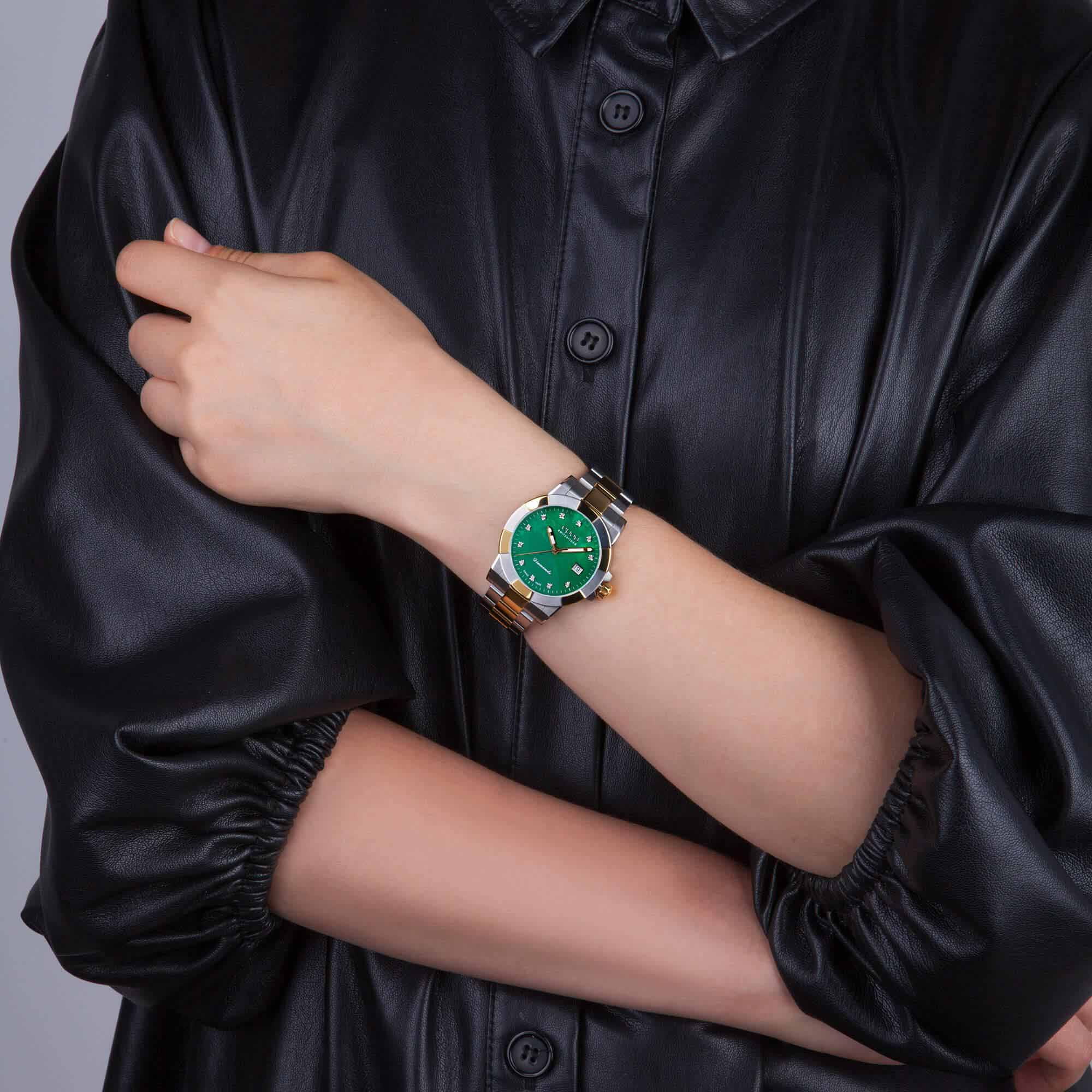 Женские кварцевые часы Epos из коллекции Ladies Diamonds — это элегантный аксессуар, сочетающий швейцарское качество и изысканный дизайн. Корпус диаметром 36 мм и толщиной 9 мм выполнен из нержавеющей стали 316L, безель с частичным PVD-покрытиемPVDУльтратонкое покрытие наносится в технике вакуумного напыления, сочетает в себе нитрид титана особой прочности со слоем золота или оксида хрома. Несёт в себе декоративную или защитную функцию. розового золота. Циферблат с перламутровой вставкой зелёного оттенка выполнен по технологии «солнечные лучи» и украшен синтетическими бриллиантами. Циферблат защищён сапфировым стекломСапфировое стеклоПрочный и надёжный материал из кристалла сапфира синтетического происхождения, характеризующийся особой твёрдостью и устойчивостью к царапинам и повреждениям.. Метки в виде точек инкрустированы бриллиантами. Стрелки с люминесцентным покрытиемЛюминесцентное покрытиеПозволяет считывать показания времени в темноте. Производители наносят на стрелки, часовые индексы, безель или поверхность циферблата светонакопительный состав, дающий холодное свечение., обеспечивающим хорошую читаемость в темноте. Окошко даты расположено в положении 3 часов. Механизм — швейцарский кварцевый калибр Ronda 705. Часы оснащены стальным браслетом комбинированного цвета на раскладной застёжкеРаскладная застёжкаТакой тип застёжки используется только на браслетах из металла. Она никогда не раскрывается полностью, происходит разделение на 2 и более частей. Раскладывающая застёжка снизит вероятность потери часов к минимуму.. Водонепроницаемость 50 м позволяет использовать часы в повседневных условиях. Гарантия — 24 месяца. Идеальный выбор для тех, кто ценит роскошь, стиль и точность.