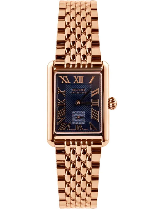 Epos 8002.702.24.26.34 — женская модель с утончённым классическим стилем и прямоугольным корпусом, выполненным из нержавеющей стали с PVD-покрытиемPVDУльтратонкое покрытие наносится в технике вакуумного напыления, сочетает в себе нитрид титана особой прочности со слоем золота или оксида хрома. Несёт в себе декоративную или защитную функцию.. Черный циферблат оформлен римскими индексами и утончённым узором «Clous de Paris», создающим игру света и подчёркивающим глубину дизайна. Защитную функцию выполняет сапфировое стеклоСапфировое стеклоПрочный и надёжный материал из кристалла сапфира синтетического происхождения, характеризующийся особой твёрдостью и устойчивостью к царапинам и повреждениям., стойкое к царапинам и сохраняющее прозрачность. В основе лежит швейцарский автоматический механизм, обеспечивающий стабильность и точность хода. Функции включают индикацию часов, минут и малую секундную шкалу, расположенную в позиции «6 часов». Стальной браслетс PVD-покрытиемPVDУльтратонкое покрытие наносится в технике вакуумного напыления, сочетает в себе нитрид титана особой прочности со слоем золота или оксида хрома. Несёт в себе декоративную или защитную функцию. на раскладной застёжкеРаскладная застёжкаТакой тип застёжки используется только на браслетах из металла. Она никогда не раскрывается полностью, происходит разделение на 2 и более частей. Раскладывающая застёжка снизит вероятность потери часов к минимуму., которая гармонично завершает строгий образ модели.