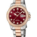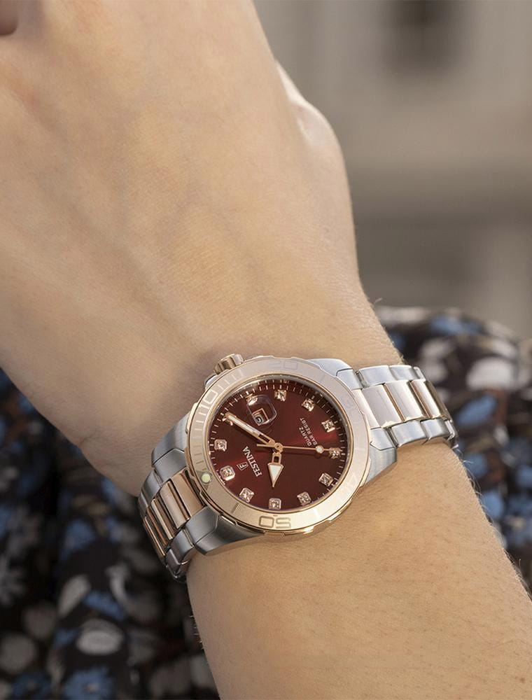 Яркий стиль и функциональность этих часов придутся по душе активной девушке. Кварцевый механизм с высокой точностью. Минеральное стеклоМинеральное стеклоМинеральное стекло представляет собой искусственно выращенный минерал кварца. Такое стекло отличается особой устойчивостью к повреждениям и царапинам. Уступает по некоторым качествам сапфировому стеклу. устойчивое к появлению царапин, обладающее высокой прозрачностью. Циферблат выполнен по технологии Sunray (солнечные лучи). Класс водозащиты: 100 метров, позволит плавать, нырять и заниматься другими водными видами спорта. Стрелки с люминесцентным покрытиемЛюминесцентное покрытиеПозволяет считывать показания времени в темноте. Производители наносят на стрелки, часовые индексы, безель или поверхность циферблата светонакопительный состав, дающий холодное свечение.. Корпус часов изготовлен из нержавеющей стали. БезельБезельВнешний ободок, закрепляющий стекло. В спортивных часах так называется поворотное кольцо с делениями на циферблате, выполняет роль таймера – замеряет отрезки времени на шкале. Неподвижный безель – элемент декора. Однонаправленно вращающийся безель на дайверских часах позволяет фиксировать моменты погружения и выныривания на поверхность. c PVD-покрытиемPVDУльтратонкое покрытие наносится в технике вакуумного напыления, сочетает в себе нитрид титана особой прочности со слоем золота или оксида хрома. Несёт в себе декоративную или защитную функцию.. Браслет с частичным PVD-покрытиемPVDУльтратонкое покрытие наносится в технике вакуумного напыления, сочетает в себе нитрид титана особой прочности со слоем золота или оксида хрома. Несёт в себе декоративную или защитную функцию. и с раскладной застёжкойРаскладная застёжкаТакой тип застёжки используется только на браслетах из металла. Она никогда не раскрывается полностью, происходит разделение на 2 и более частей. Раскладывающая застёжка снизит вероятность потери часов к минимуму..