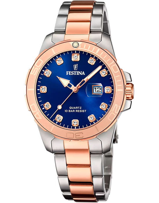 Кварцевый механизм с высокой точностью. Минеральное стеклоМинеральное стеклоМинеральное стекло представляет собой искусственно выращенный минерал кварца. Такое стекло отличается особой устойчивостью к повреждениям и царапинам. Уступает по некоторым качествам сапфировому стеклу. устойчивое к появлению царапин, обладающее высокой прозрачностью. Стрелки с люминесцентным покрытиемЛюминесцентное покрытиеПозволяет считывать показания времени в темноте. Производители наносят на стрелки, часовые индексы, безель или поверхность циферблата светонакопительный состав, дающий холодное свечение.. Циферблат инкрустирован кристаллами. Окошко даты с увеличительным стеклом. Класс водозащиты: 100 метров, позволит плавать, нырять и заниматься другими водными видами спорта. Поворотный безельБезельВнешний ободок, закрепляющий стекло. В спортивных часах так называется поворотное кольцо с делениями на циферблате, выполняет роль таймера – замеряет отрезки времени на шкале. Неподвижный безель – элемент декора. Однонаправленно вращающийся безель на дайверских часах позволяет фиксировать моменты погружения и выныривания на поверхность.. Корпус часов изготовлен из нержавеющей стали с PVD-покрытиемPVDУльтратонкое покрытие наносится в технике вакуумного напыления, сочетает в себе нитрид титана особой прочности со слоем золота или оксида хрома. Несёт в себе декоративную или защитную функцию.. Браслет из нержавеющей стали частично с PVD-покрытиемPVDУльтратонкое покрытие наносится в технике вакуумного напыления, сочетает в себе нитрид титана особой прочности со слоем золота или оксида хрома. Несёт в себе декоративную или защитную функцию..