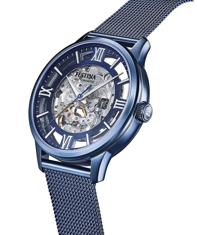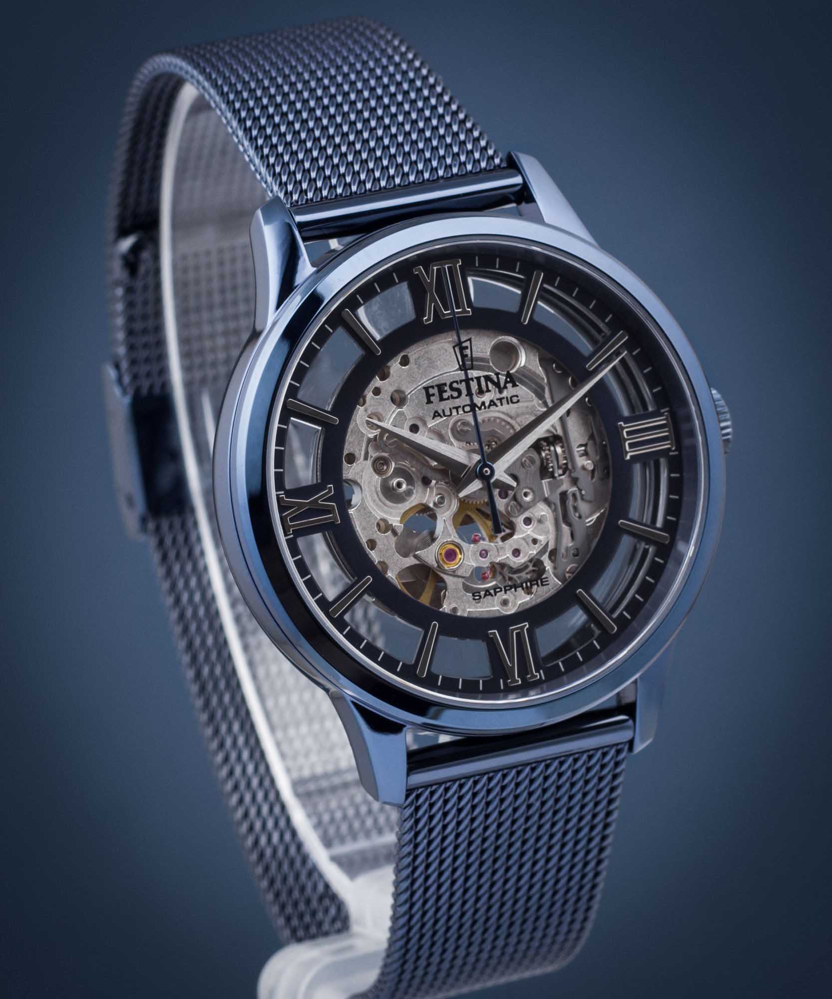 Мужские механические часы-скелетоны Festina Automatic F20574/1, механический механизм (автоматический калибр) с высокой точностью. Сапфировое стеклоСапфировое стеклоПрочный и надёжный материал из кристалла сапфира синтетического происхождения, характеризующийся особой твёрдостью и устойчивостью к царапинам и повреждениям. устойчивое к появлению царапин, обладающее высокой прозрачностью. Класс водозащиты: 50 метров, позволит защитить корпус от случайных брызг или капель дождя. Корпус часов изготовлен из стали с PVD-покрытиемPVDУльтратонкое покрытие наносится в технике вакуумного напыления, сочетает в себе нитрид титана особой прочности со слоем золота или оксида хрома. Несёт в себе декоративную или защитную функцию.. Стальной миланского плетения браслет на раскладной застёжкеРаскладная застёжкаТакой тип застёжки используется только на браслетах из металла. Она никогда не раскрывается полностью, происходит разделение на 2 и более частей. Раскладывающая застёжка снизит вероятность потери часов к минимуму. с PVD-покрытиемPVDУльтратонкое покрытие наносится в технике вакуумного напыления, сочетает в себе нитрид титана особой прочности со слоем золота или оксида хрома. Несёт в себе декоративную или защитную функцию.. В механизме 21 камень. Циферблат с метками в виде штрихов и римских цифр. Рифленая заводная головка. Прозрачная задняя крышка.