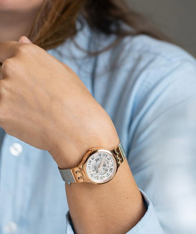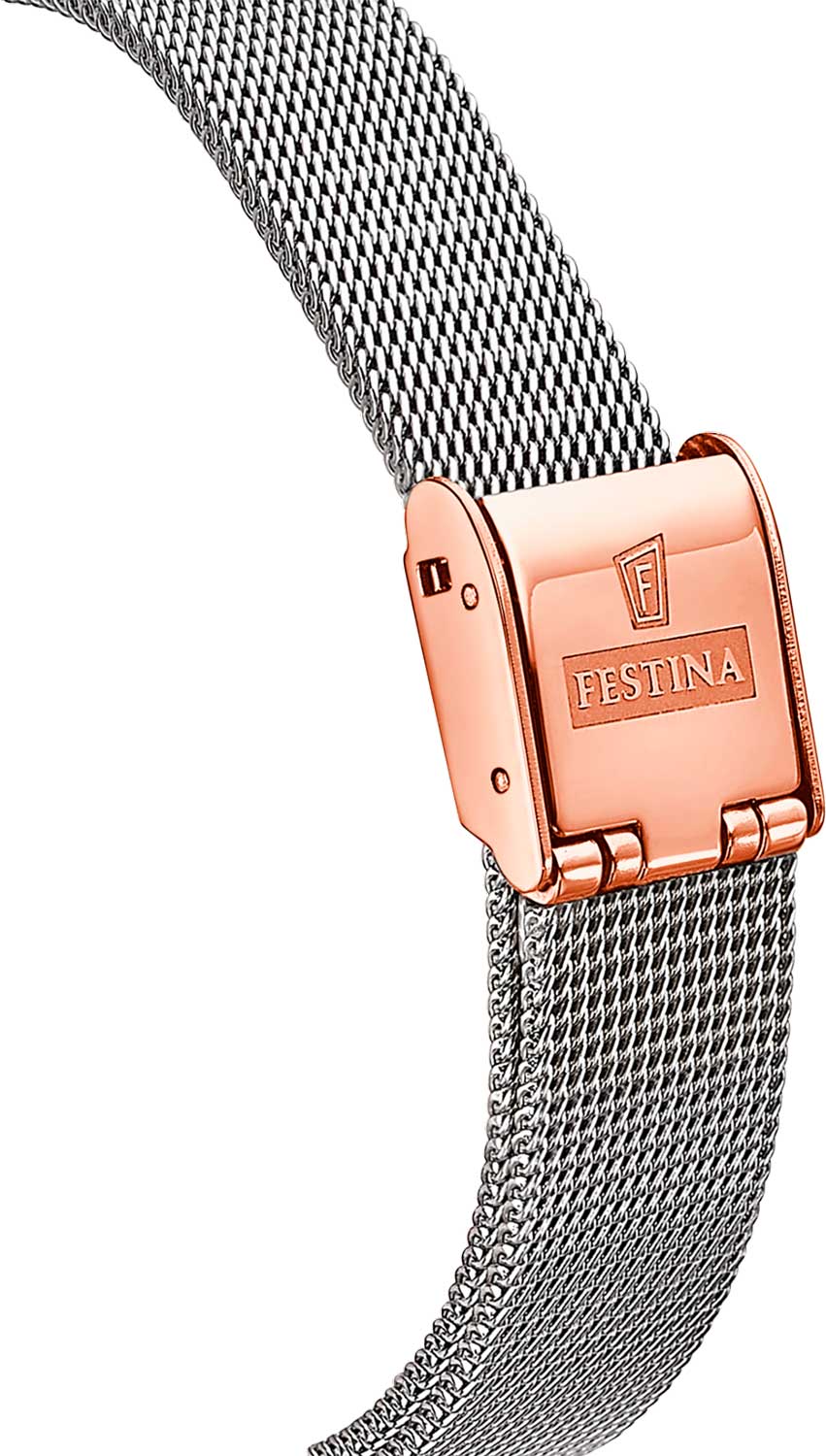 Женские механические часы-скелетоны Festina Automatic F20581/1, механический механизм (автоматический калибр) с высокой точностью. Сапфировое стеклоСапфировое стеклоПрочный и надёжный материал из кристалла сапфира синтетического происхождения, характеризующийся особой твёрдостью и устойчивостью к царапинам и повреждениям. устойчивое к появлению царапин, обладающее высокой прозрачностью. Класс водозащиты: 50 метров, позволит защитить корпус от случайных брызг или капель дождя. Корпус часов изготовлен из стали с PVD-покрытиемPVDУльтратонкое покрытие наносится в технике вакуумного напыления, сочетает в себе нитрид титана особой прочности со слоем золота или оксида хрома. Несёт в себе декоративную или защитную функцию.. Стальной миланского плетения браслет на раскладной застёжкеРаскладная застёжкаТакой тип застёжки используется только на браслетах из металла. Она никогда не раскрывается полностью, происходит разделение на 2 и более частей. Раскладывающая застёжка снизит вероятность потери часов к минимуму.. БезельБезельВнешний ободок, закрепляющий стекло. В спортивных часах так называется поворотное кольцо с делениями на циферблате, выполняет роль таймера – замеряет отрезки времени на шкале. Неподвижный безель – элемент декора. Однонаправленно вращающийся безель на дайверских часах позволяет фиксировать моменты погружения и выныривания на поверхность. с PVD-покрытиемPVDУльтратонкое покрытие наносится в технике вакуумного напыления, сочетает в себе нитрид титана особой прочности со слоем золота или оксида хрома. Несёт в себе декоративную или защитную функцию.. Циферблат с метками в виде штрихов и арабских цифр. Рифленая заводная головка.