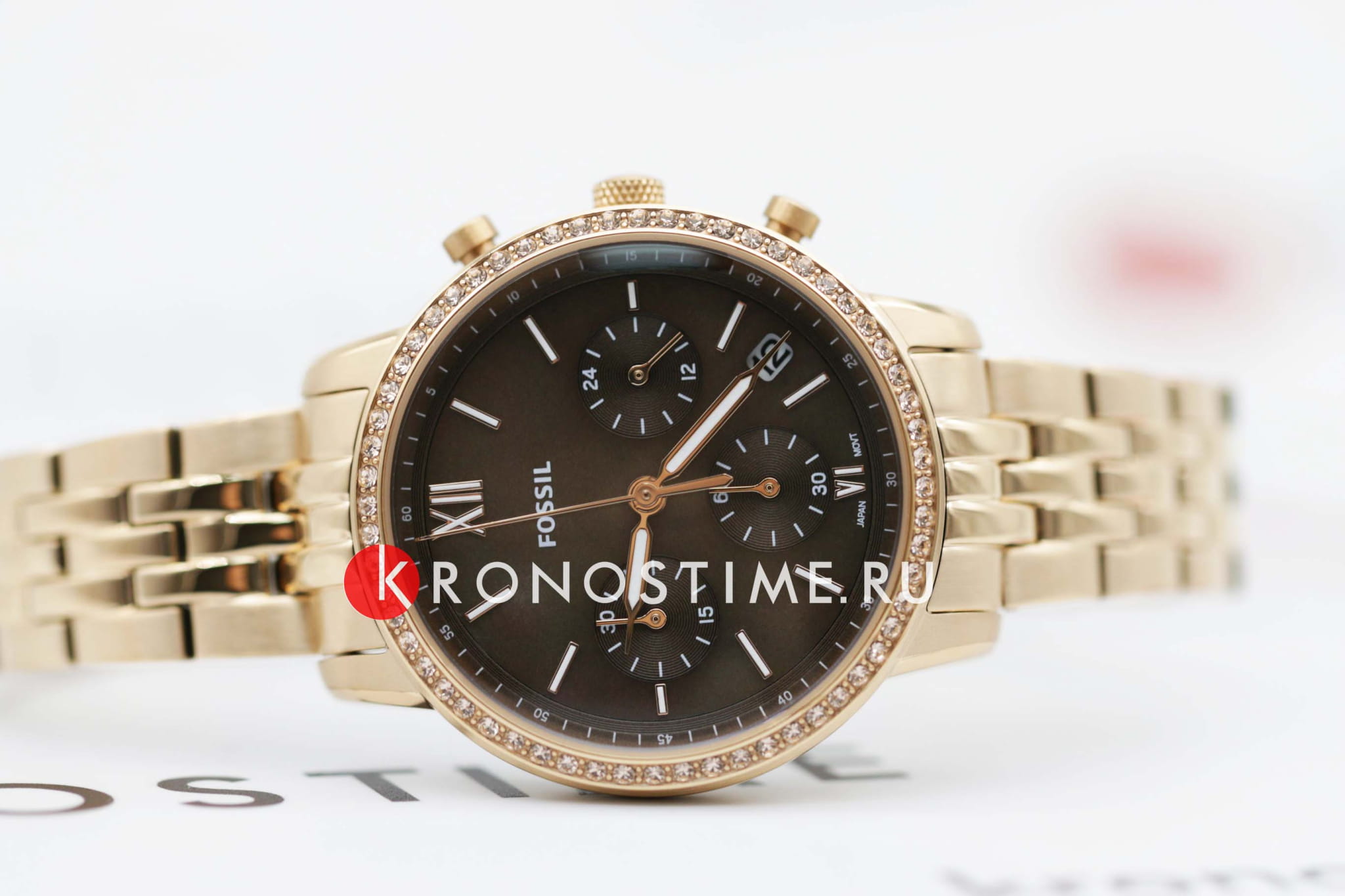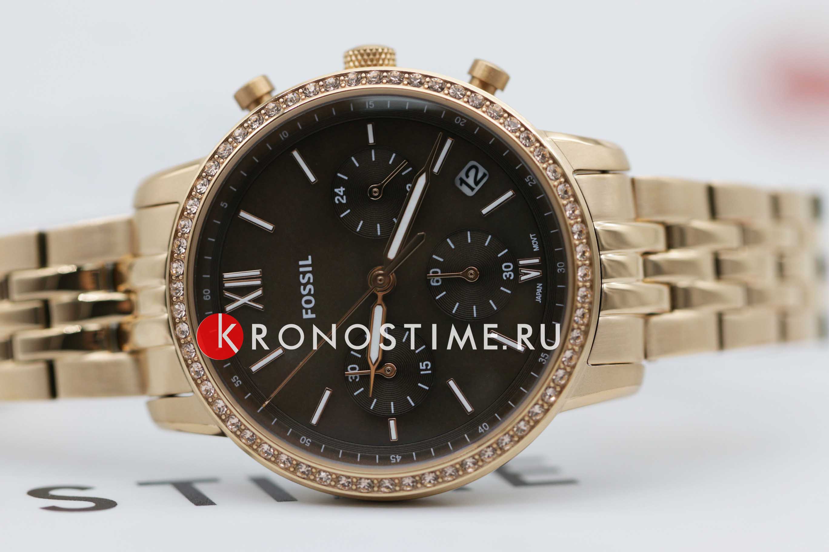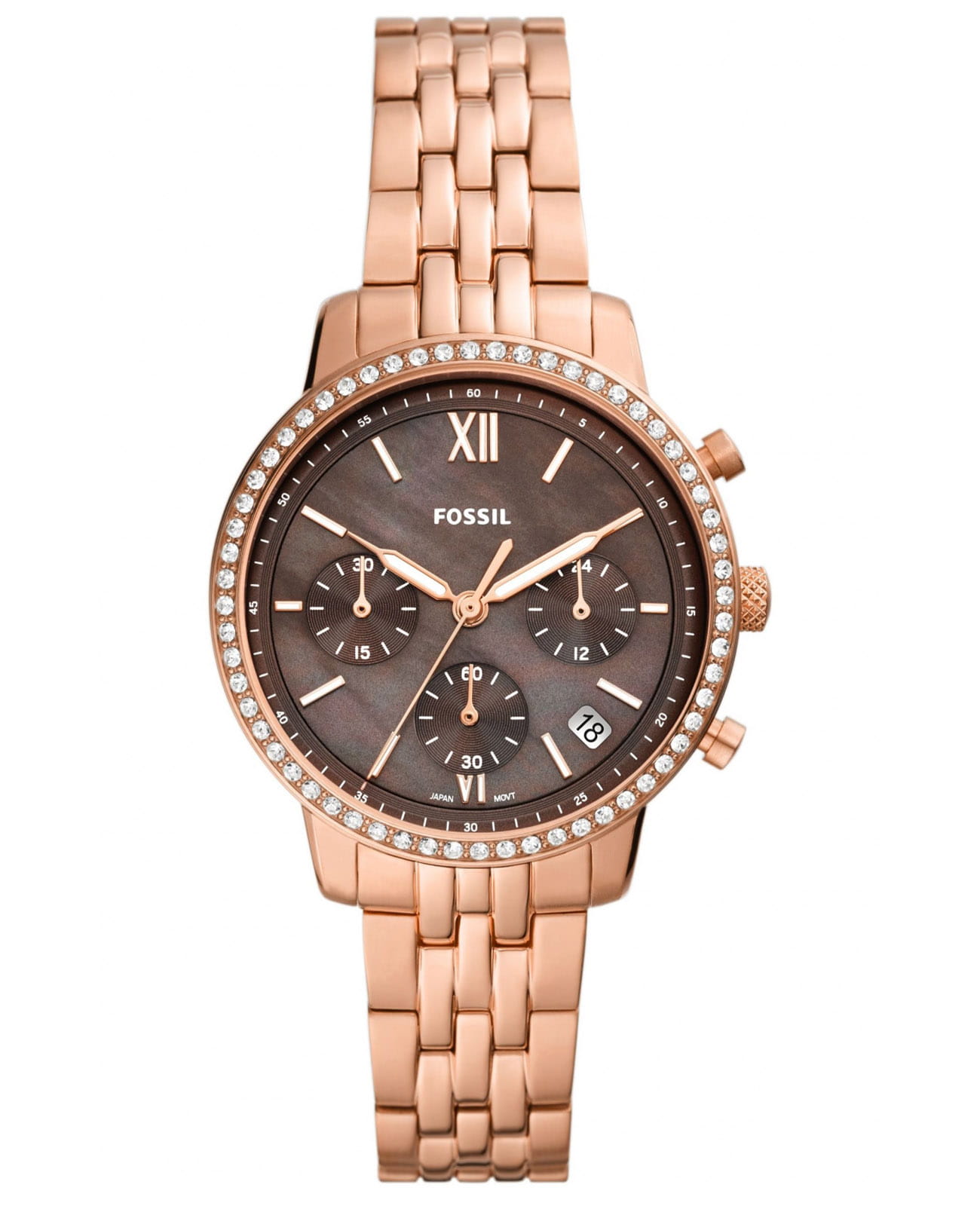 Женские американские часы-хронографХронографФункция позволяет измерять отрезки времени с особой точностью: часы, минуты, секунды. Верным признаком хронографа является наличие на циферблате 3 дополнительных окошек-счётчиков. с секундомеромСекундомерСекундоме́р — прибор, способный измерять интервалы времени с точностью до долей секунды. Fossil Neutra ES5218, кварцевый механизм с высокой точностью. Класс водозащиты: 50 метров, позволит защитить корпус от случайных брызг или капель дождя. Корпус и браслет часов изготовлен из стали с IP-покрытиемIP-покрытиеМетод ионного напыления. Демонстрирует повышенную устойчивость к истиранию, окислению и химическим веществам. Под воздействием высокого давления и температуры около 1500°C молекулы металла надёжно соединяются с частицами корпуса часов. цвета розовое золото. Система отображения времени 12-ти и 24-х часового формата. БезельБезельВнешний ободок, закрепляющий стекло. В спортивных часах так называется поворотное кольцо с делениями на циферблате, выполняет роль таймера – замеряет отрезки времени на шкале. Неподвижный безель – элемент декора. Однонаправленно вращающийся безель на дайверских часах позволяет фиксировать моменты погружения и выныривания на поверхность. украшен кристаллами. Циферблат перламутровый коричневый с окошком даты между 4 и 5 часами.