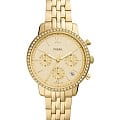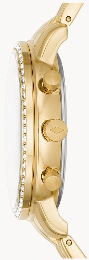 Женские американские часы-хронографХронографФункция позволяет измерять отрезки времени с особой точностью: часы, минуты, секунды. Верным признаком хронографа является наличие на циферблате 3 дополнительных окошек-счётчиков. с секундомеромСекундомерСекундоме́р — прибор, способный измерять интервалы времени с точностью до долей секунды. Fossil Neutra ES5219, кварцевый механизм с высокой точностью. Класс водозащиты: 50 метров, позволит защитить корпус от случайных брызг или капель дождя. Корпус и браслет часов изготовлен из стали с IP-покрытиемIP-покрытиеМетод ионного напыления. Демонстрирует повышенную устойчивость к истиранию, окислению и химическим веществам. Под воздействием высокого давления и температуры около 1500°C молекулы металла надёжно соединяются с частицами корпуса часов. золотистого цвета. Система отображения времени 12-ти и 24-х часового формата. БезельБезельВнешний ободок, закрепляющий стекло. В спортивных часах так называется поворотное кольцо с делениями на циферблате, выполняет роль таймера – замеряет отрезки времени на шкале. Неподвижный безель – элемент декора. Однонаправленно вращающийся безель на дайверских часах позволяет фиксировать моменты погружения и выныривания на поверхность. украшен кристаллами. Окошко даты между 4 и 5 часами.