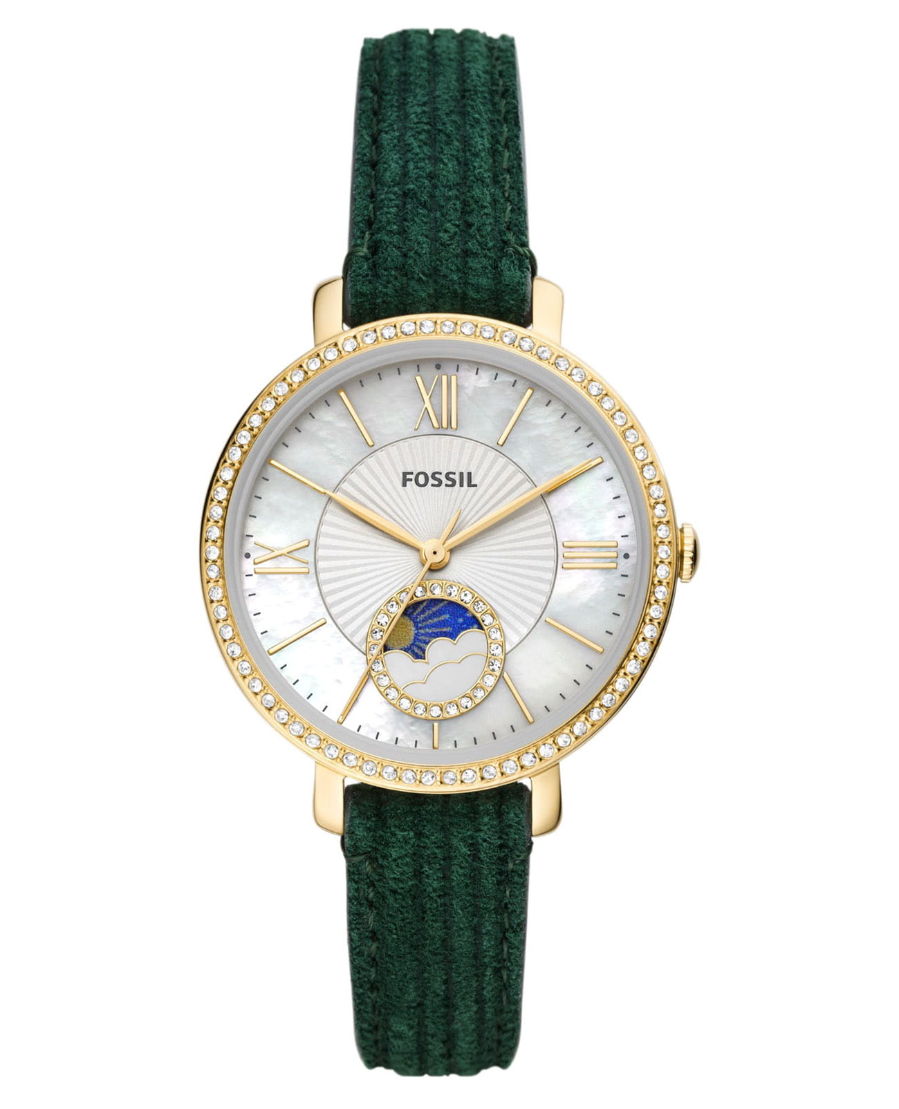 Американские женские наручные часы Fossil Jacqueline ES5244. Кварцевый механизм с высокой точностью. Класс водозащиты: 30 метров, позволит защитить корпус от случайных брызг или капель дождя. Индикатор дня и ночи на отдельном циферблате. Корпус часов изготовлен из стали с IP-покрытиемIP-покрытиеМетод ионного напыления. Демонстрирует повышенную устойчивость к истиранию, окислению и химическим веществам. Под воздействием высокого давления и температуры около 1500°C молекулы металла надёжно соединяются с частицами корпуса часов.. БезельБезельВнешний ободок, закрепляющий стекло. В спортивных часах так называется поворотное кольцо с делениями на циферблате, выполняет роль таймера – замеряет отрезки времени на шкале. Неподвижный безель – элемент декора. Однонаправленно вращающийся безель на дайверских часах позволяет фиксировать моменты погружения и выныривания на поверхность. украшен кристаллами.