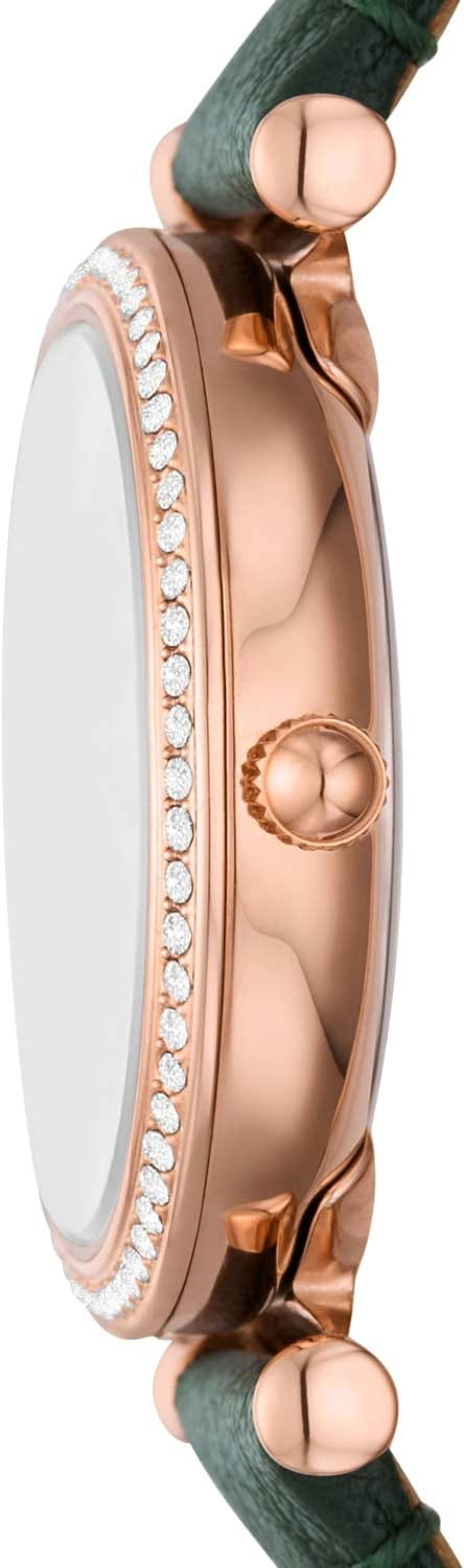 Часы Fossil ES5370 представляют собой стильный аксессуар, который станет отличным дополнением к вашему образу. Эти женские наручные часы, произведенные в США, оснащены надежным кварцевым механизмом. Корпус выполнен из стали с розово-золотистым IP-покрытиемIP-покрытиеМетод ионного напыления. Демонстрирует повышенную устойчивость к истиранию, окислению и химическим веществам. Под воздействием высокого давления и температуры около 1500°C молекулы металла надёжно соединяются с частицами корпуса часов., а безельБезельВнешний ободок, закрепляющий стекло. В спортивных часах так называется поворотное кольцо с делениями на циферблате, выполняет роль таймера – замеряет отрезки времени на шкале. Неподвижный безель – элемент декора. Однонаправленно вращающийся безель на дайверских часах позволяет фиксировать моменты погружения и выныривания на поверхность. украшен кристаллами, что придает часам утонченный и изысканный вид. Зеленый циферблат, изготовленный по технологии Sunray, создает эффект солнечных лучей и привлекает внимание своей глубиной. Метки в виде штрихов и римских цифр VI и XII подчеркивают классический стиль, а рифленая заводная головка добавляет изящества. Стрелки с люминесцентным покрытиемЛюминесцентное покрытиеПозволяет считывать показания времени в темноте. Производители наносят на стрелки, часовые индексы, безель или поверхность циферблата светонакопительный состав, дающий холодное свечение. позволяют легко считывать время даже в условиях низкой освещенности. Часы комплектуются фирменным кожаным ремешком LiteHide с классической застежкой, который обеспечивает комфортное ношение и надежную фиксацию на запястье. Водозащита 50WR позволяет не беспокоиться о случайных брызгах воды. Минеральное стеклоМинеральное стеклоМинеральное стекло представляет собой искусственно выращенный минерал кварца. Такое стекло отличается особой устойчивостью к повреждениям и царапинам. Уступает по некоторым качествам сапфировому стеклу. защищает циферблат от царапин и повреждений. С диаметром корпуса 28 мм и шириной ремешка 12 мм, эти часы идеально подойдут для тех, кто ценит элегантность и качество.