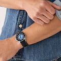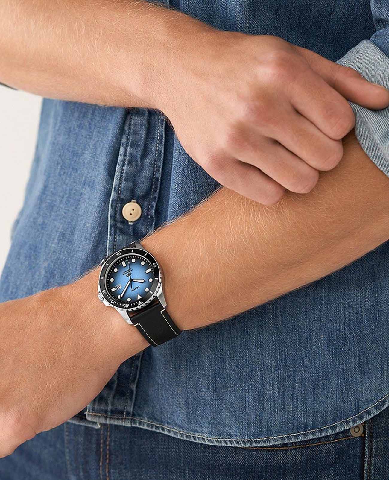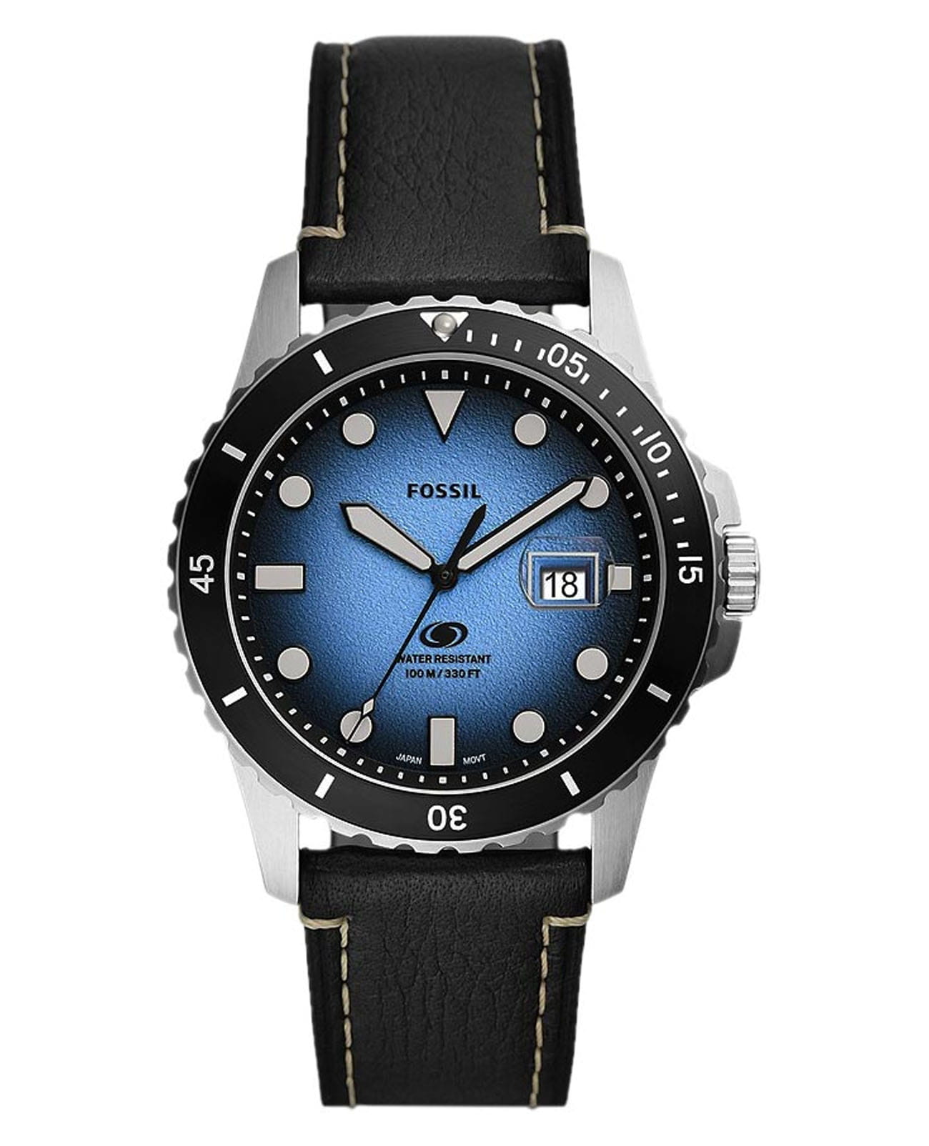Мужские наручные часы с минеральным стекломМинеральное стеклоМинеральное стекло представляет собой искусственно выращенный минерал кварца. Такое стекло отличается особой устойчивостью к повреждениям и царапинам. Уступает по некоторым качествам сапфировому стеклу. Fossil Blue FS5960, кварцевый механизм с высокой точностью. Мужские часы в дайверском стиле. Корпус часов изготовлен из стали. БезельБезельВнешний ободок, закрепляющий стекло. В спортивных часах так называется поворотное кольцо с делениями на циферблате, выполняет роль таймера – замеряет отрезки времени на шкале. Неподвижный безель – элемент декора. Однонаправленно вращающийся безель на дайверских часах позволяет фиксировать моменты погружения и выныривания на поверхность. с IP-покрытиемIP-покрытиеМетод ионного напыления. Демонстрирует повышенную устойчивость к истиранию, окислению и химическим веществам. Под воздействием высокого давления и температуры около 1500°C молекулы металла надёжно соединяются с частицами корпуса часов.. Рифленый безель с минутной шкалой. Градиентный циферблат. Мечевидные стрелки. Окошко даты с увеличительным стеклом находится в положении 3 часа. Класс водозащиты: 100 метров, позволит плавать, нырять и заниматься другими водными видами спорта. Ремешок из экокожи на стандартной застёжке.