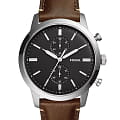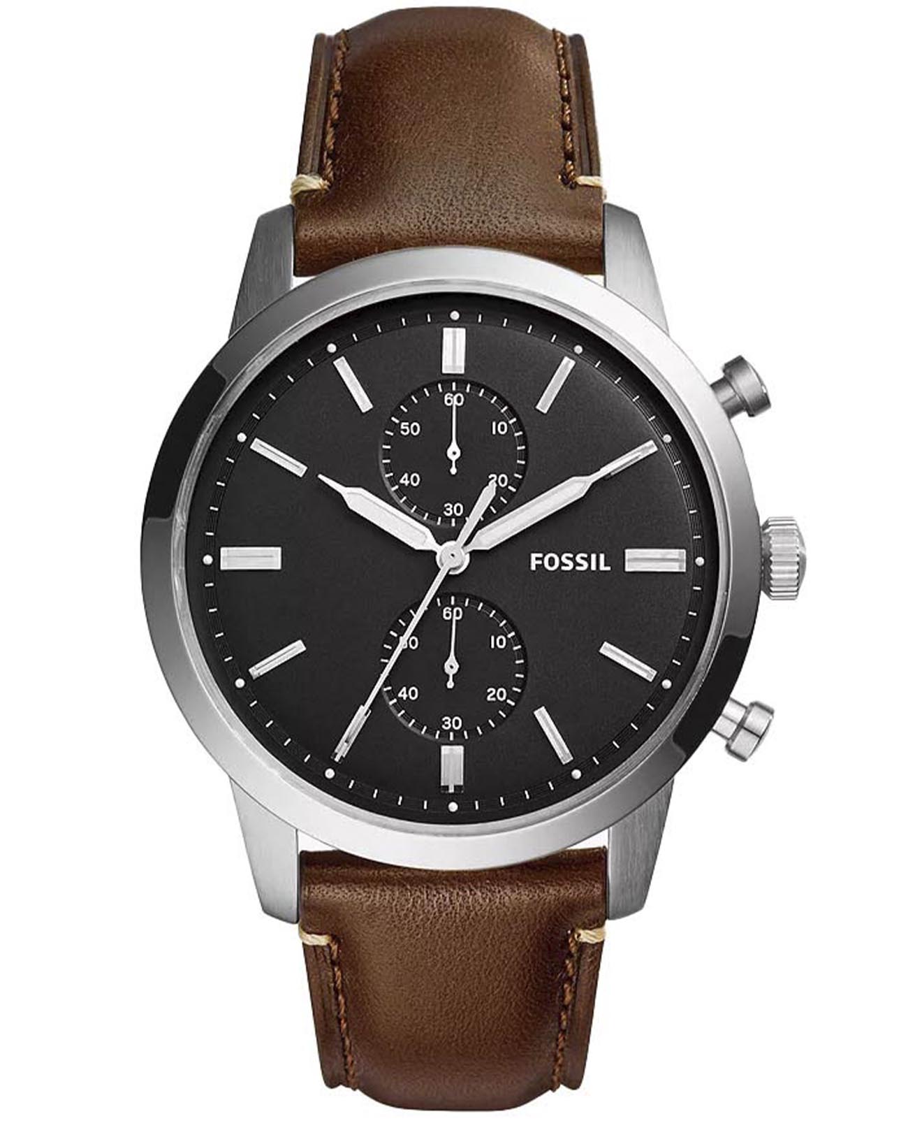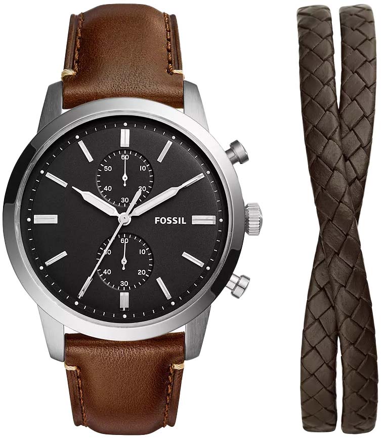 Мужские наручные часы-хронографХронографФункция позволяет измерять отрезки времени с особой точностью: часы, минуты, секунды. Верным признаком хронографа является наличие на циферблате 3 дополнительных окошек-счётчиков. Fossil Townsman FS5967SET с надёжным кварцевым механизмом. Корпус часов изготовлен из нержавеющей стали. Минеральное стеклоМинеральное стеклоМинеральное стекло представляет собой искусственно выращенный минерал кварца. Такое стекло отличается особой устойчивостью к повреждениям и царапинам. Уступает по некоторым качествам сапфировому стеклу. устойчивое к мелким механическим повреждениям. Кожаный ремешок на стандартной застёжке. Класс водозащиты: 50 метров, позволит защитить корпус от случайных брызг или капель дождя. Стрелки с люминесцентным покрытиемЛюминесцентное покрытиеПозволяет считывать показания времени в темноте. Производители наносят на стрелки, часовые индексы, безель или поверхность циферблата светонакопительный состав, дающий холодное свечение.. В комплекте стильный кожаный браслет.