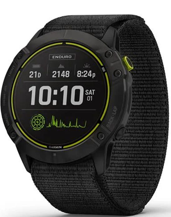 Умные многофункциональные мужские часы Garmin Enduro 010-02408-01, электронный механизм с высокой точностью. Класс водозащиты: 100 метров, позволит плавать, нырять и заниматься другими водными видами спорта. Титановый корпус DLC-покрытиеDLC-покрытиеDiamond like carbon - одно из лучших видов покрытия, представляющее собой углерод с алмазными свойствами. На поверхность материала наносятся распавшиеся молекулы углерода, превращающиеся в плёнку из алмазоподобных связей, которая перенимает твёрдость алмаза.. Циферблат с сапфировым стекломСапфировое стеклоПрочный и надёжный материал из кристалла сапфира синтетического происхождения, характеризующийся особой твёрдостью и устойчивостью к царапинам и повреждениям.. Экран с светодиодной подсветкойСветодиодная подсветкаСветодиодная или LED-подсветка обеспечивает появление яркого холодного свечения за счёт LED-элементов - маленьких лампочек. Они потребляют минимальное количество энергии, чаще всего можно встретить 1 светодиод, в нижней части циферблата.. Нейлоновый ремешок.