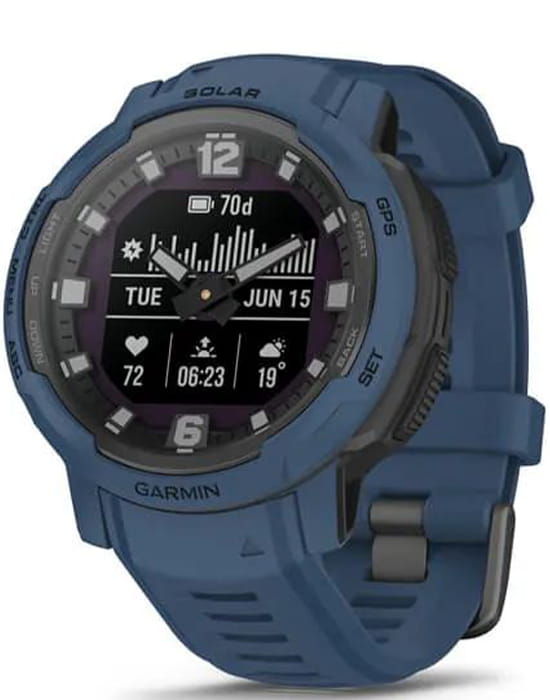 Умные многофункциональные мужские часы Garmin Instinct Crossover Solar 010-02730-02, электронный механизм с высокой точностью. Класс водозащиты: 100 метров, позволит плавать, нырять и заниматься другими водными видами спорта. Материал корпуса: Фиброармированный полимер Ударопрочный корпусУдаропрочный корпусМеханизм заключён в корпус, выполненный из современных материалов, устойчивых к ударам, механическим повреждениям и падению с высоты: инновационный пластик, карбон, нержавеющая сталь, титан.. Минеральное стеклоМинеральное стеклоМинеральное стекло представляет собой искусственно выращенный минерал кварца. Такое стекло отличается особой устойчивостью к повреждениям и царапинам. Уступает по некоторым качествам сапфировому стеклу. которое было химически усиленно. Экран с светодиодной подсветкойСветодиодная подсветкаСветодиодная или LED-подсветка обеспечивает появление яркого холодного свечения за счёт LED-элементов - маленьких лампочек. Они потребляют минимальное количество энергии, чаще всего можно встретить 1 светодиод, в нижней части циферблата..