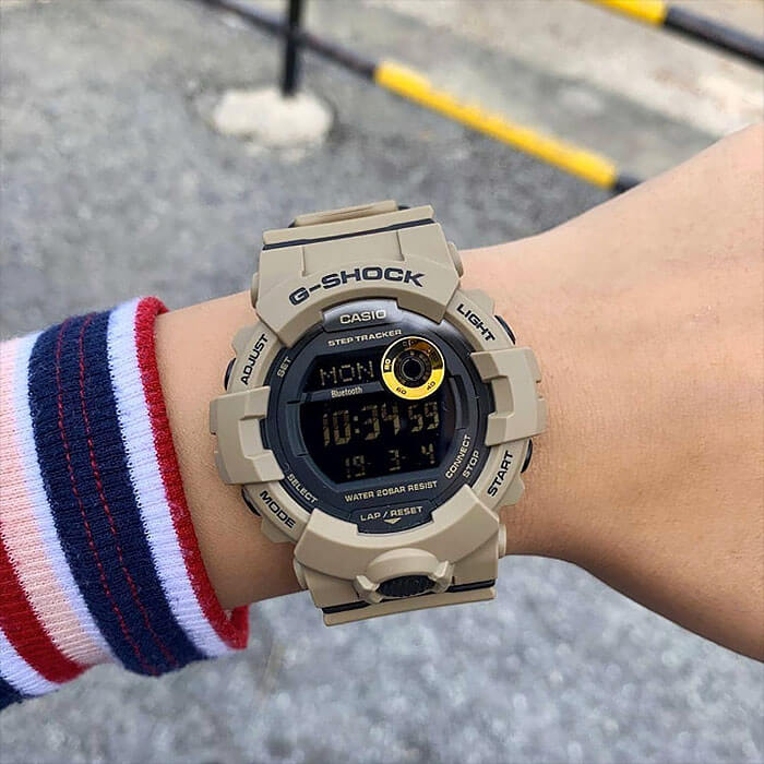 Это не просто стильный и практичный аксессуар, модель песочного цвета является идеальным помощником в правильной организации тренировок. Часы для фитнеса и бега оснащены шагомером, измеряющим их в количестве от 0 до 999999, многофункциональным таймером, секундомером с памятью на 200 результатов. С помощью технологии BluetoothBluetoothСовременная технология, позволяющая синхронизировать часы с телефоном и переносить данные. Часы с Bluetooth расширяют возможности вашего смартфона и делают его использование ещё более удобным. данные о физической активности могут передаваться и анализироваться в вашем смартфоне, для этого было разработано приложение G-Shock Connected Phone. Кварцевый механизм японского производства. Батарейка рассчитана на 3 года работы. Ударопрочный корпусУдаропрочный корпусМеханизм заключён в корпус, выполненный из современных материалов, устойчивых к ударам, механическим повреждениям и падению с высоты: инновационный пластик, карбон, нержавеющая сталь, титан. из полимерного материала. Минеральное стекло. Водостойкость до 20 бар. Циферблат со светодиодной подсветкойСветодиодная подсветкаСветодиодная или LED-подсветка обеспечивает появление яркого холодного свечения за счёт LED-элементов - маленьких лампочек. Они потребляют минимальное количество энергии, чаще всего можно встретить 1 светодиод, в нижней части циферблата., стрелки с люминесцентным покрытиемЛюминесцентное покрытиеПозволяет считывать показания времени в темноте. Производители наносят на стрелки, часовые индексы, безель или поверхность циферблата светонакопительный состав, дающий холодное свечение.. Будильник, мировое времяМировое время Полезное часовое усложнение, отображающее время в основных городах и известных областях по всему миру, оно связано с часовыми поясами, удобно для путешественников и бизнесменов. , календарь до 2099 года, функция поиска телефона, хронографХронографФункция позволяет измерять отрезки времени с особой точностью: часы, минуты, секунды. Верным признаком хронографа является наличие на циферблате 3 дополнительных окошек-счётчиков.. Габариты: 54,1 x 48,6 x 15,5 мм.