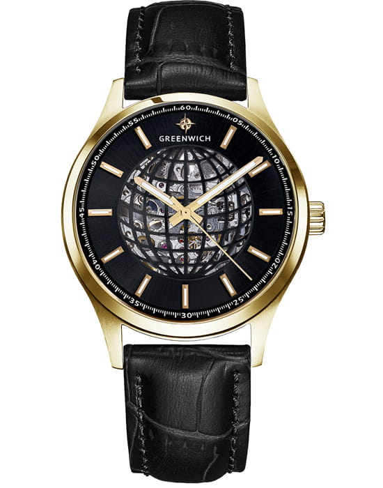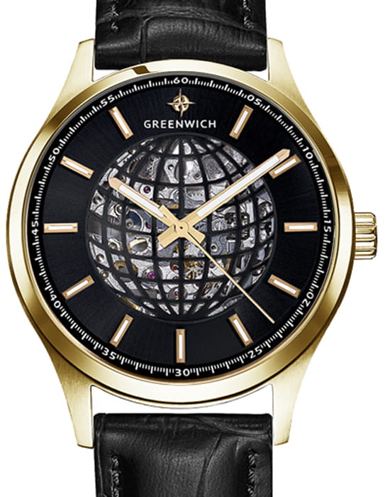 Часы Greenwich GW 056.21.31 из коллекции Globe — элегантная мужская модель, сочетающая изысканный дизайн и высокую функциональность. Корпус диаметром 43 мм выполнен из нержавеющей стали с PVD-покрытиемPVDУльтратонкое покрытие наносится в технике вакуумного напыления, сочетает в себе нитрид титана особой прочности со слоем золота или оксида хрома. Несёт в себе декоративную или защитную функцию. жёлтого золота. Скелетонизированный циферблат с оригинальным элементом в виде глобуса защищён минеральным стекломМинеральное стеклоМинеральное стекло представляет собой искусственно выращенный минерал кварца. Такое стекло отличается особой устойчивостью к повреждениям и царапинам. Уступает по некоторым качествам сапфировому стеклу., устойчивым к царапинам.