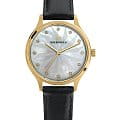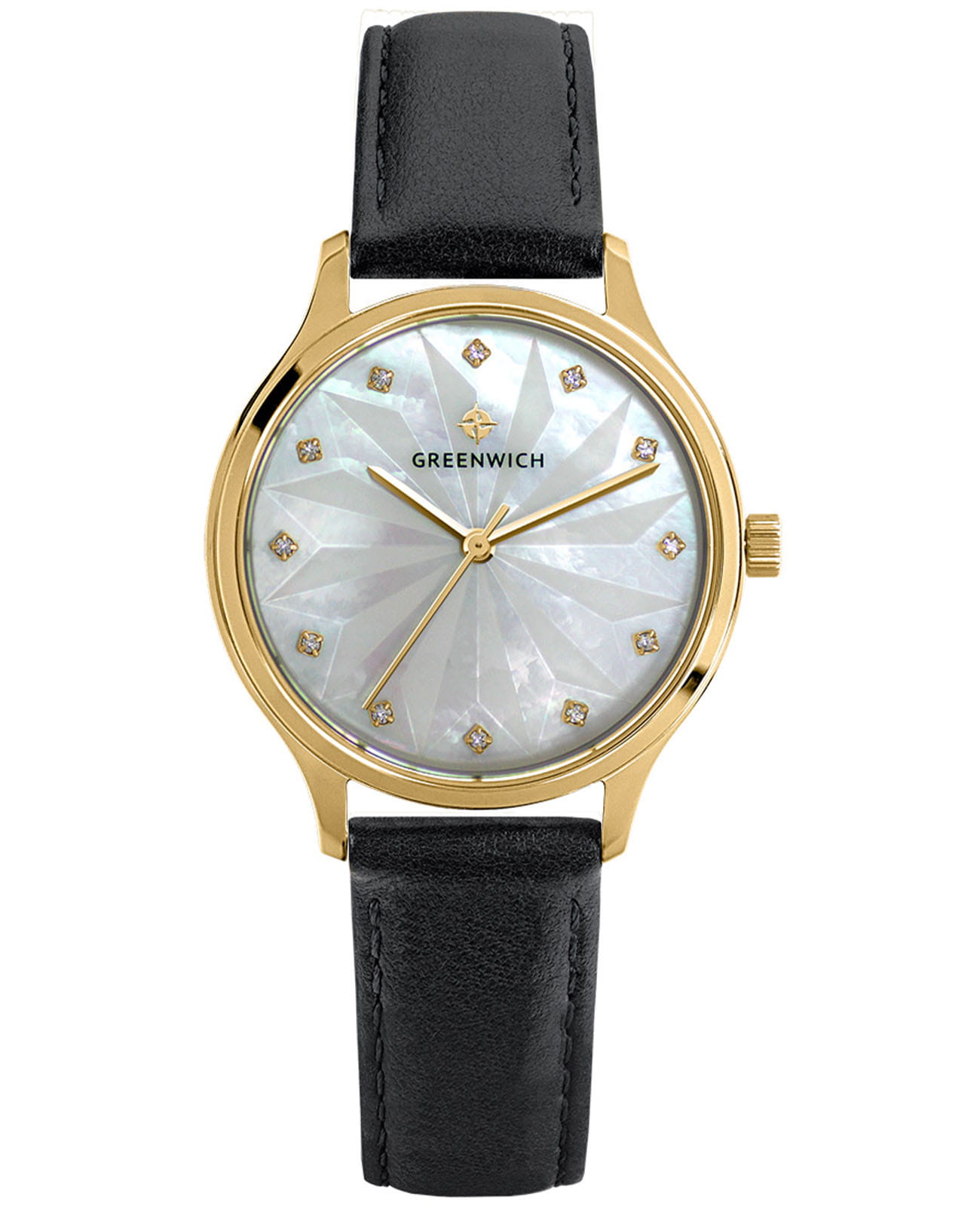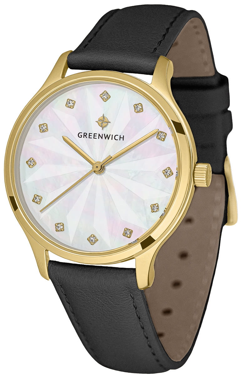 Женские английские часы с минеральным стекломМинеральное стеклоМинеральное стекло представляет собой искусственно выращенный минерал кварца. Такое стекло отличается особой устойчивостью к повреждениям и царапинам. Уступает по некоторым качествам сапфировому стеклу. Greenwich Callisto GW 341.21.53, кварцевый механизм с высокой точностью. Класс водозащиты: 50 метров, позволит защитить корпус от случайных брызг или капель дождя. Корпус часов изготовлен из стали с PVD-покрытиемPVDУльтратонкое покрытие наносится в технике вакуумного напыления, сочетает в себе нитрид титана особой прочности со слоем золота или оксида хрома. Несёт в себе декоративную или защитную функцию.. Кожаный ремешок на стандартной застёжке. Циферблат выполнен из натурального перламутра черного цвета с эффектной гравировкой: она напоминает звезду, сияющую на ночном небе. Фианиты надежно закреплены в кастах. Кварцевый механизм Miyota отвечает за точный ход стрелок: часовой, минутной и секундной.