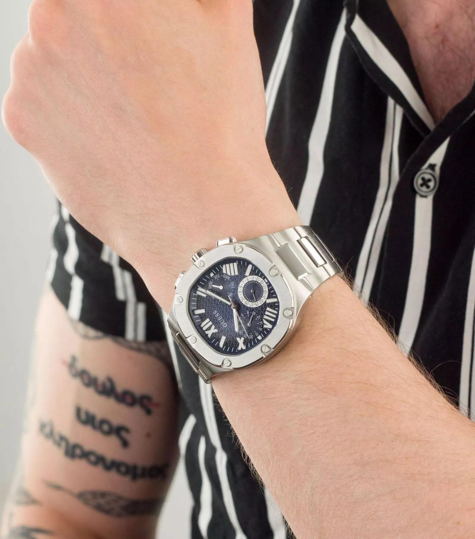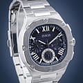 Мужские наручные часы Guess Headline GW0572G1 с минеральным стекломМинеральное стеклоМинеральное стекло представляет собой искусственно выращенный минерал кварца. Такое стекло отличается особой устойчивостью к повреждениям и царапинам. Уступает по некоторым качествам сапфировому стеклу., кварцевый механизм с высокой точностью. Класс водозащиты: 50 метров, позволит защитить корпус от случайных брызг или капель дождя. Стрелки с люминесцентным покрытиемЛюминесцентное покрытиеПозволяет считывать показания времени в темноте. Производители наносят на стрелки, часовые индексы, безель или поверхность циферблата светонакопительный состав, дающий холодное свечение.. Корпус часов и безельБезельВнешний ободок, закрепляющий стекло. В спортивных часах так называется поворотное кольцо с делениями на циферблате, выполняет роль таймера – замеряет отрезки времени на шкале. Неподвижный безель – элемент декора. Однонаправленно вращающийся безель на дайверских часах позволяет фиксировать моменты погружения и выныривания на поверхность. изготовлены из стали. Стальной браслет на раскладной застёжкеРаскладная застёжкаТакой тип застёжки используется только на браслетах из металла. Она никогда не раскрывается полностью, происходит разделение на 2 и более частей. Раскладывающая застёжка снизит вероятность потери часов к минимуму.. Рифленая заводная головка. Гильошированный циферблат. 24-х часовой формат времени, число и день недели отображаются на отдельных циферблатах. Метки в виде римских цифр и штрихов.