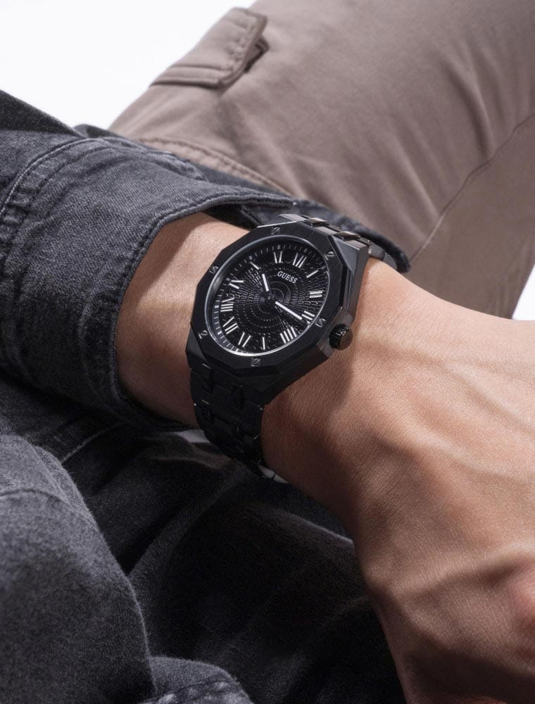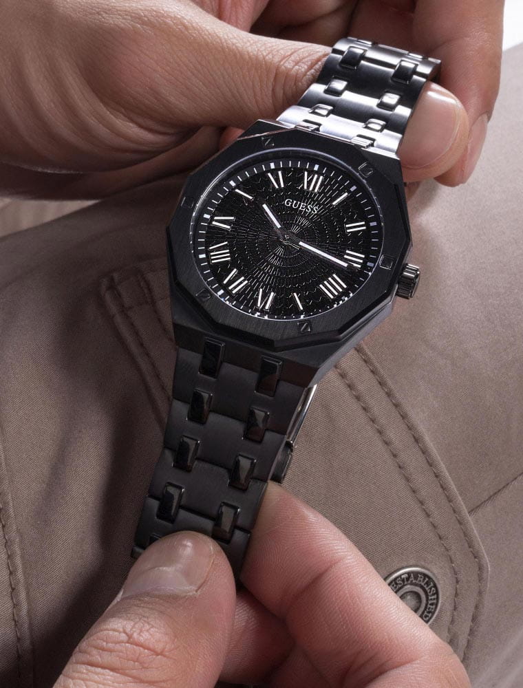 Мужские наручные часы Guess Asset GW0575G3 с минеральным стекломМинеральное стеклоМинеральное стекло представляет собой искусственно выращенный минерал кварца. Такое стекло отличается особой устойчивостью к повреждениям и царапинам. Уступает по некоторым качествам сапфировому стеклу., кварцевый механизм с высокой точностью. Класс водозащиты: 50 метров, позволит защитить корпус от случайных брызг или капель дождя. Корпус часов и безельБезельВнешний ободок, закрепляющий стекло. В спортивных часах так называется поворотное кольцо с делениями на циферблате, выполняет роль таймера – замеряет отрезки времени на шкале. Неподвижный безель – элемент декора. Однонаправленно вращающийся безель на дайверских часах позволяет фиксировать моменты погружения и выныривания на поверхность. изготовлены из стали с IP-покрытиемIP-покрытиеМетод ионного напыления. Демонстрирует повышенную устойчивость к истиранию, окислению и химическим веществам. Под воздействием высокого давления и температуры около 1500°C молекулы металла надёжно соединяются с частицами корпуса часов.. Стальной браслет на раскладной застёжкеРаскладная застёжкаТакой тип застёжки используется только на браслетах из металла. Она никогда не раскрывается полностью, происходит разделение на 2 и более частей. Раскладывающая застёжка снизит вероятность потери часов к минимуму. с IP-покрытиемIP-покрытиеМетод ионного напыления. Демонстрирует повышенную устойчивость к истиранию, окислению и химическим веществам. Под воздействием высокого давления и температуры около 1500°C молекулы металла надёжно соединяются с частицами корпуса часов.. Гильошированный циферблат. Метки в виде римских цифр. Рифленая заводная головка. Стрелки с люминесцентным покрытиемЛюминесцентное покрытиеПозволяет считывать показания времени в темноте. Производители наносят на стрелки, часовые индексы, безель или поверхность циферблата светонакопительный состав, дающий холодное свечение..