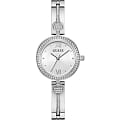 Женские наручные часы с минеральным стекломМинеральное стеклоМинеральное стекло представляет собой искусственно выращенный минерал кварца. Такое стекло отличается особой устойчивостью к повреждениям и царапинам. Уступает по некоторым качествам сапфировому стеклу. Guess Dress GW0655L1 с минеральным стекломМинеральное стеклоМинеральное стекло представляет собой искусственно выращенный минерал кварца. Такое стекло отличается особой устойчивостью к повреждениям и царапинам. Уступает по некоторым качествам сапфировому стеклу., кварцевый механизм с высокой точностью. Корпус часов изготовлен из стали. БезельБезельВнешний ободок, закрепляющий стекло. В спортивных часах так называется поворотное кольцо с делениями на циферблате, выполняет роль таймера – замеряет отрезки времени на шкале. Неподвижный безель – элемент декора. Однонаправленно вращающийся безель на дайверских часах позволяет фиксировать моменты погружения и выныривания на поверхность. украшен кристаллами. Класс водозащиты: 30 метров, позволит защитить корпус от случайных брызг или капель дождя. Стальной браслет частично укарашен кристаллами на ювелирной застёжке.