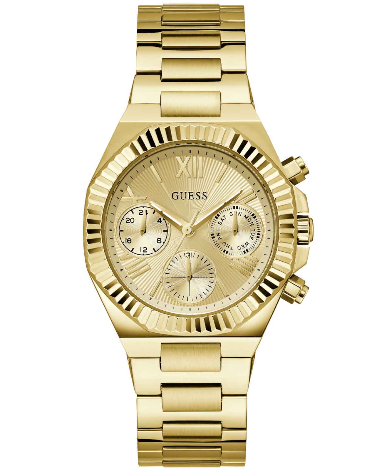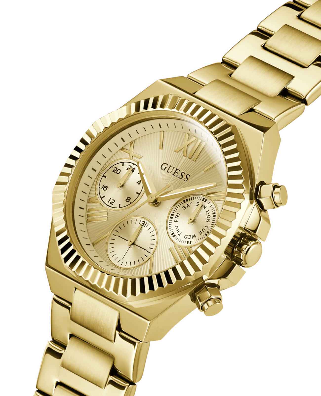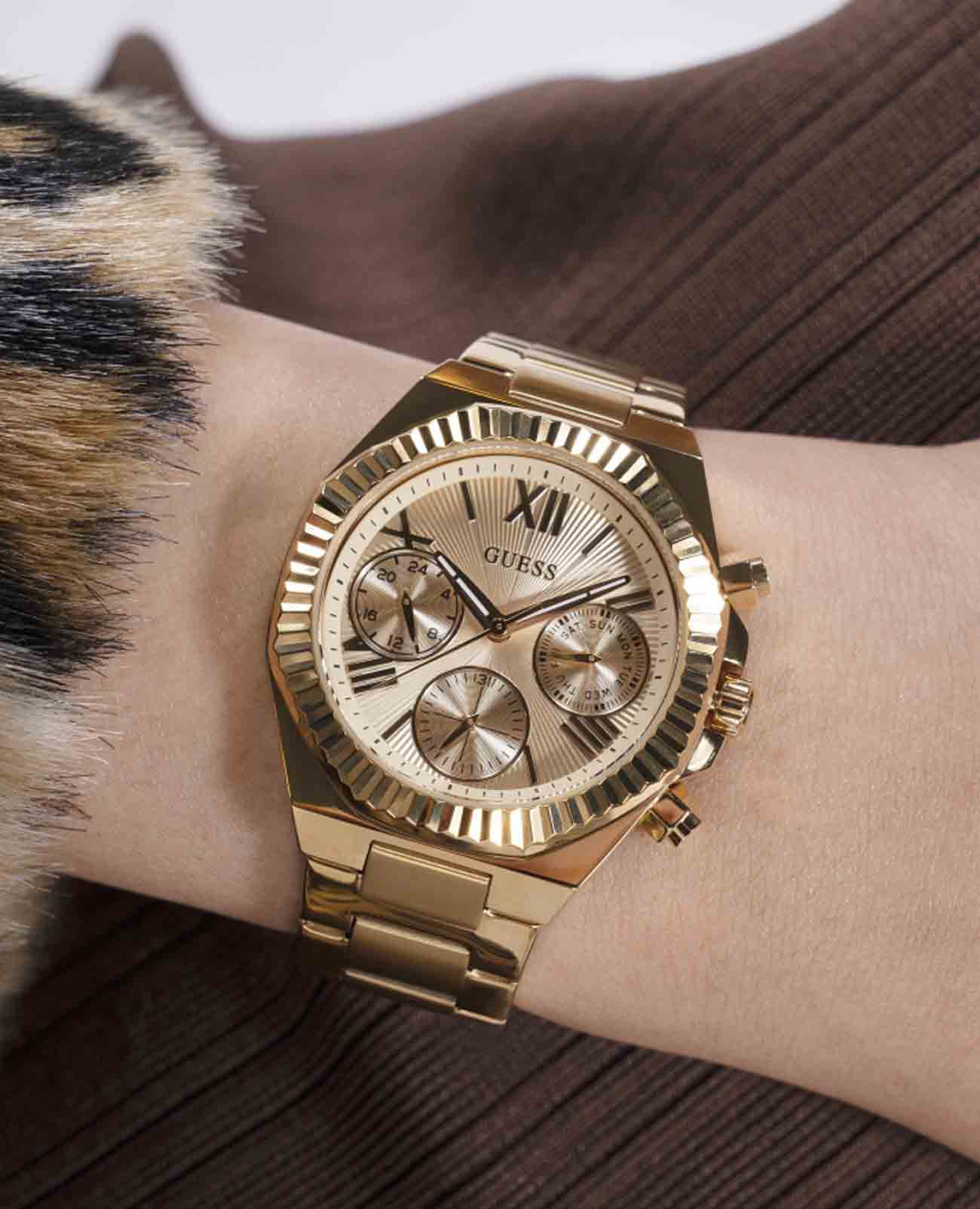 Женские наручные часы Guess Dress GW0770L2 с минеральным стекломМинеральное стеклоМинеральное стекло представляет собой искусственно выращенный минерал кварца. Такое стекло отличается особой устойчивостью к повреждениям и царапинам. Уступает по некоторым качествам сапфировому стеклу., кварцевый механизм с высокой точностью. Корпус часов изготовлен из стали с IP-покрытиемIP-покрытиеМетод ионного напыления. Демонстрирует повышенную устойчивость к истиранию, окислению и химическим веществам. Под воздействием высокого давления и температуры около 1500°C молекулы металла надёжно соединяются с частицами корпуса часов.. Стрелки с люминесцентным покрытиемЛюминесцентное покрытиеПозволяет считывать показания времени в темноте. Производители наносят на стрелки, часовые индексы, безель или поверхность циферблата светонакопительный состав, дающий холодное свечение.. Класс водозащиты: 50 метров, позволит защитить корпус от случайных брызг или капель дождя. Стальной браслет с IP-покрытиемIP-покрытиеМетод ионного напыления. Демонстрирует повышенную устойчивость к истиранию, окислению и химическим веществам. Под воздействием высокого давления и температуры около 1500°C молекулы металла надёжно соединяются с частицами корпуса часов. на раскладной застёжкеРаскладная застёжкаТакой тип застёжки используется только на браслетах из металла. Она никогда не раскрывается полностью, происходит разделение на 2 и более частей. Раскладывающая застёжка снизит вероятность потери часов к минимуму..